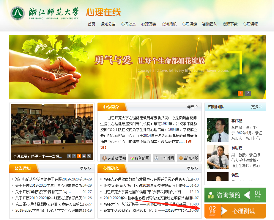 电脑端在地址栏中输入http://xlzx.zjnu.edu.cn/登录心理测试首页,点击页面右下角“心理测试”。