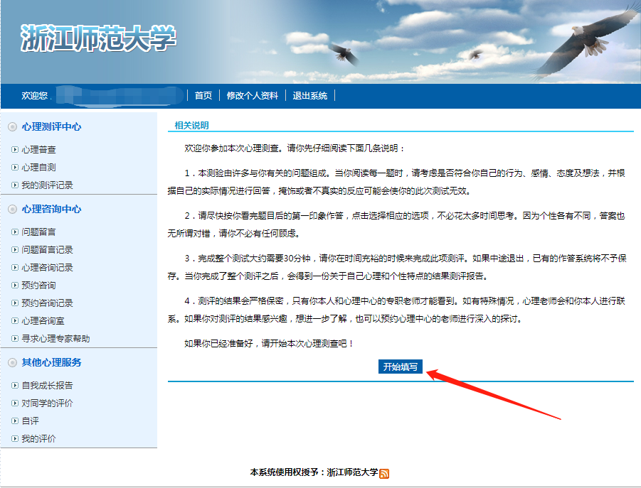 登陆后会跳出一个“相关说明”,请认真阅读。阅读完后,点击“开始填写”,即开始心理测试。整个测试过程大约需要40分钟,请认真耐心完成。