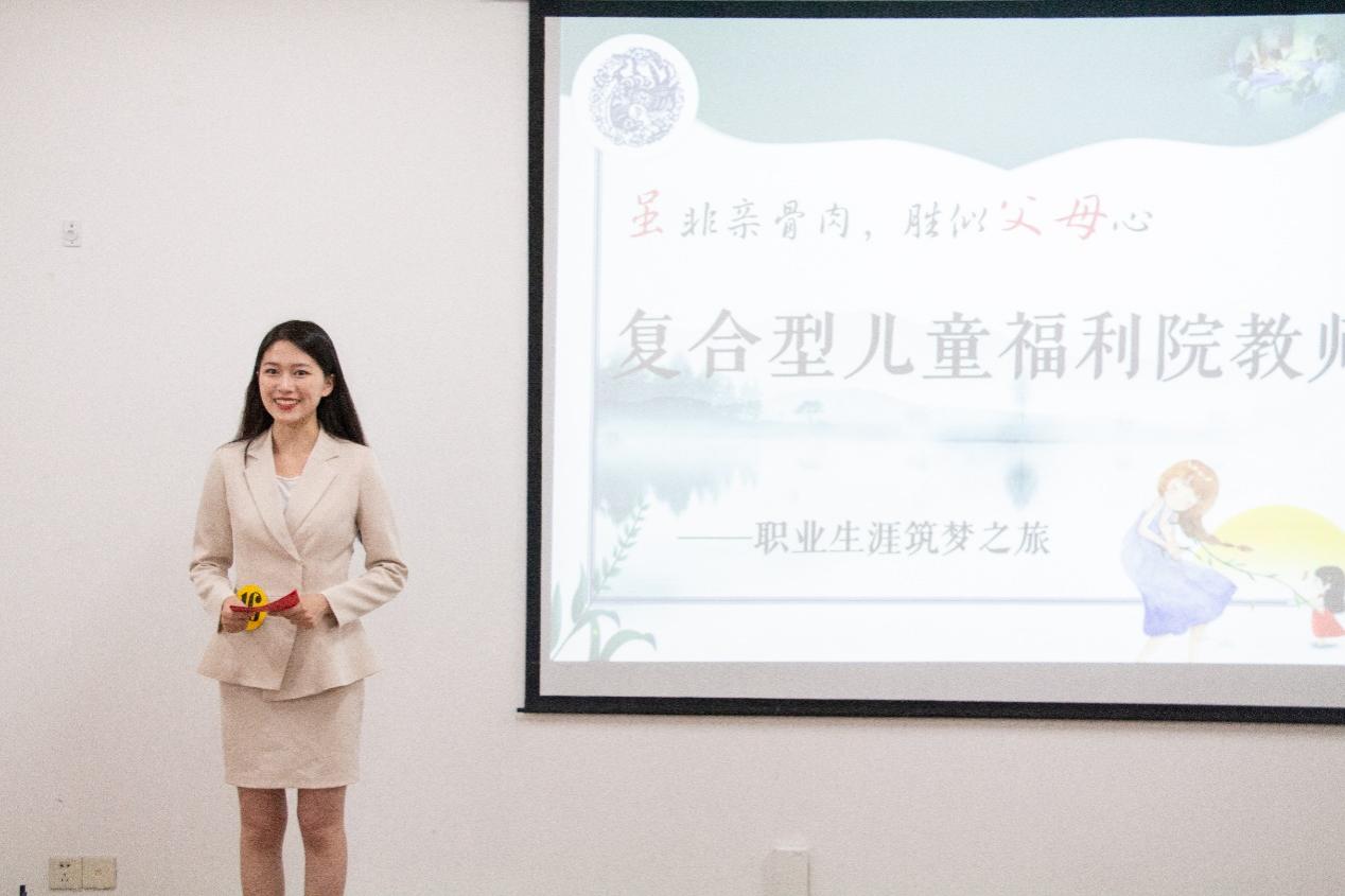 在主题陈述环节,我院高一禾同学以“筑梦儿童福利,追寻教育之月”为引,讲述一名儿童福利院教师的成长之旅。由于童年与母亲在福利院的经历,让高一禾切身感受到当下孤残儿童的身心发展难以与普通家庭孩子处于同步进程。“如果把我的职业生涯规划看作一场‘追寻月亮的旅程’,自我认知就是望向月亮的开始”,高一禾真实分析自身职业兴趣类型、性格特征、职业价值观,希望成为谆谆教诲的教育家,燃烧自己照亮他人。