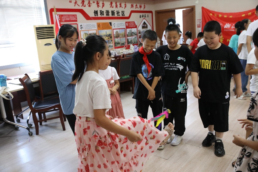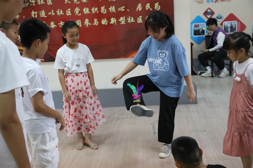 气氛活跃起来后,踢毽子活动也开展得如火如荼。一个、两个、三个……毽子在空中上下翻飞,小朋友们的笑声随着毽子不停的落地而接连不断。欢声笑语间,活动拉近了同学们彼此的距离,强健了孩子们的体魄。