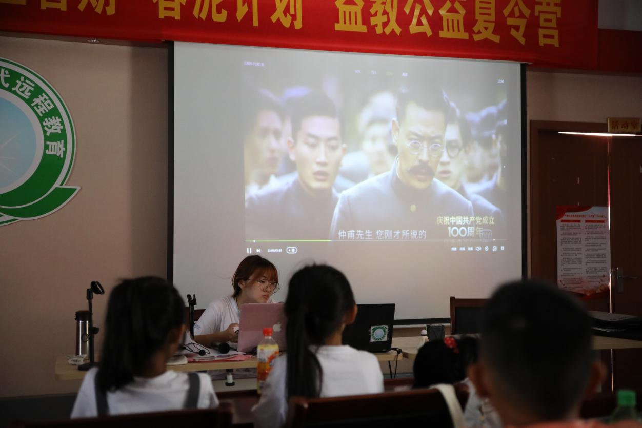 恰逢建党百年之际,实践队成员着眼于光辉的党建历史,带领着小朋友们一起观看红色影片《觉醒年代》,穿越时空,回到百年前的那段激情燃烧的红色岁月。实践队成员们携手夏令营的数十名儿童,一起回顾各路革命先烈经过新文化运动和五四运动思想觉醒的洗礼后,所开启的建党救国的革命征途,以期在历史中探寻党建思想密钥、汲取奋进力量,共同领会初心之纯、主义之真、信仰之坚和理想之美。