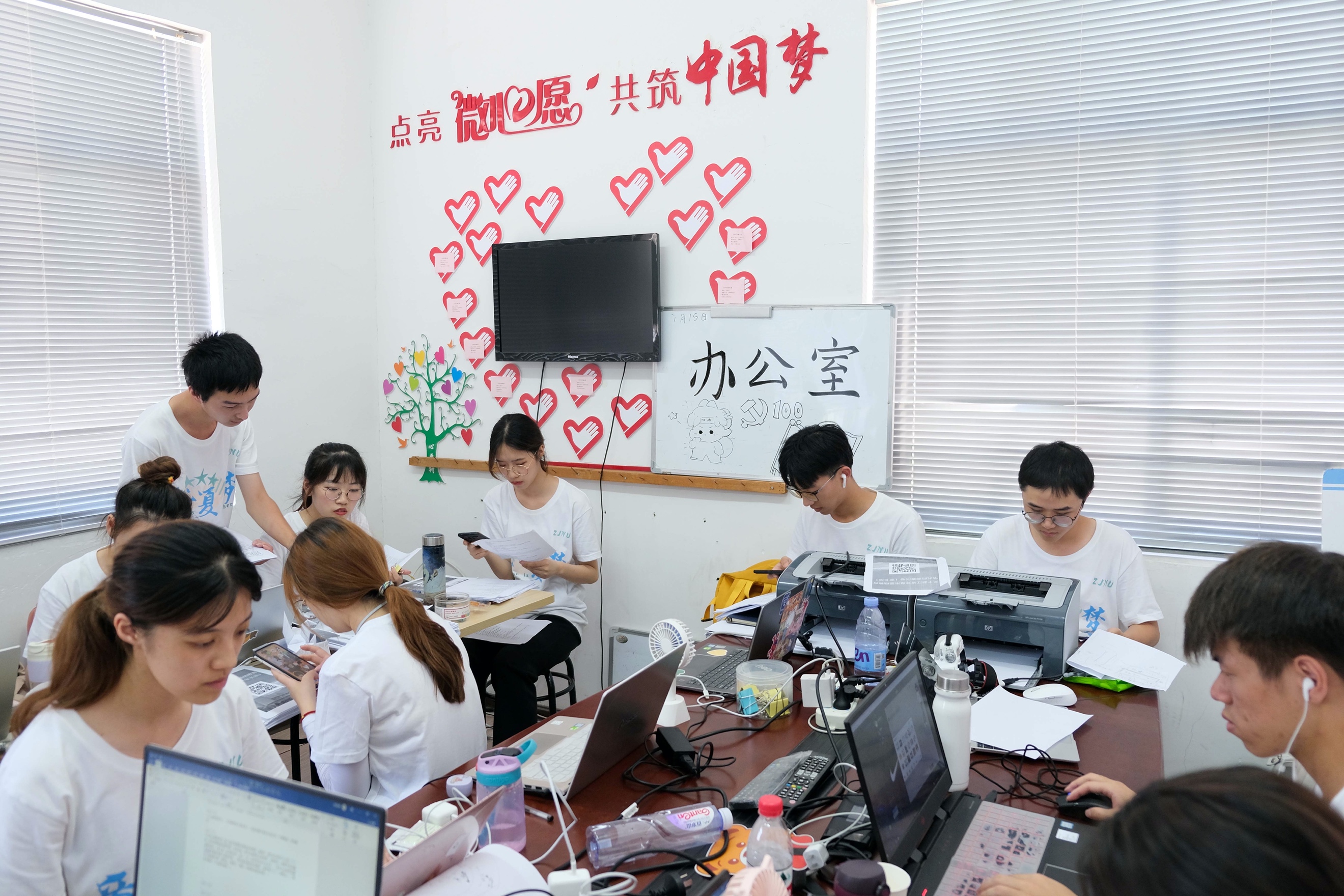 会议结束后,叶老师来到了办公室和后勤厨房,了解和指导同学们在课堂背后的各项工作。此时,办公室里的同学们正在电脑前进行着紧张的备课、外宣、调研、活动策划等工作,厨房里的同学们则展示起了娴熟的切菜技能。