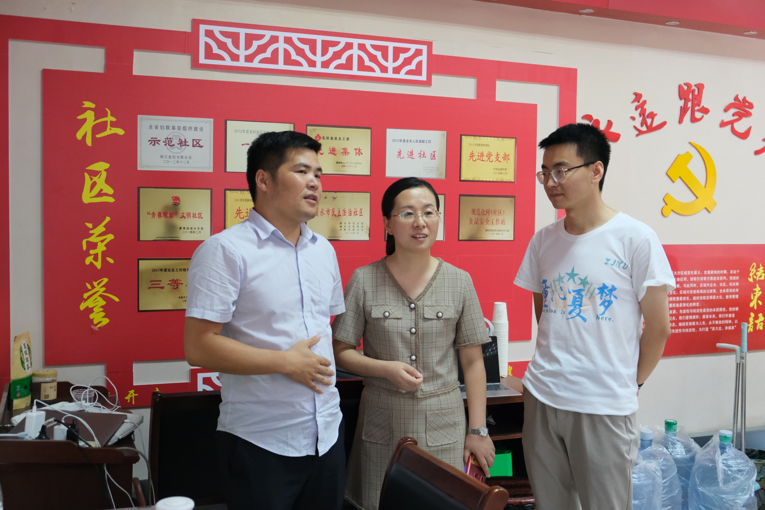7月15日中午,教师教育学院团委副书记兼学工办主任叶青老师来到丽水龙泉大沙社区,代表学院看望并慰问在这里展开社会实践的“童心夏梦”暑期实践队。陪同人员有大沙社区党委书记王旭平、社区工作人员、实践队带队老师蒲伟军等。