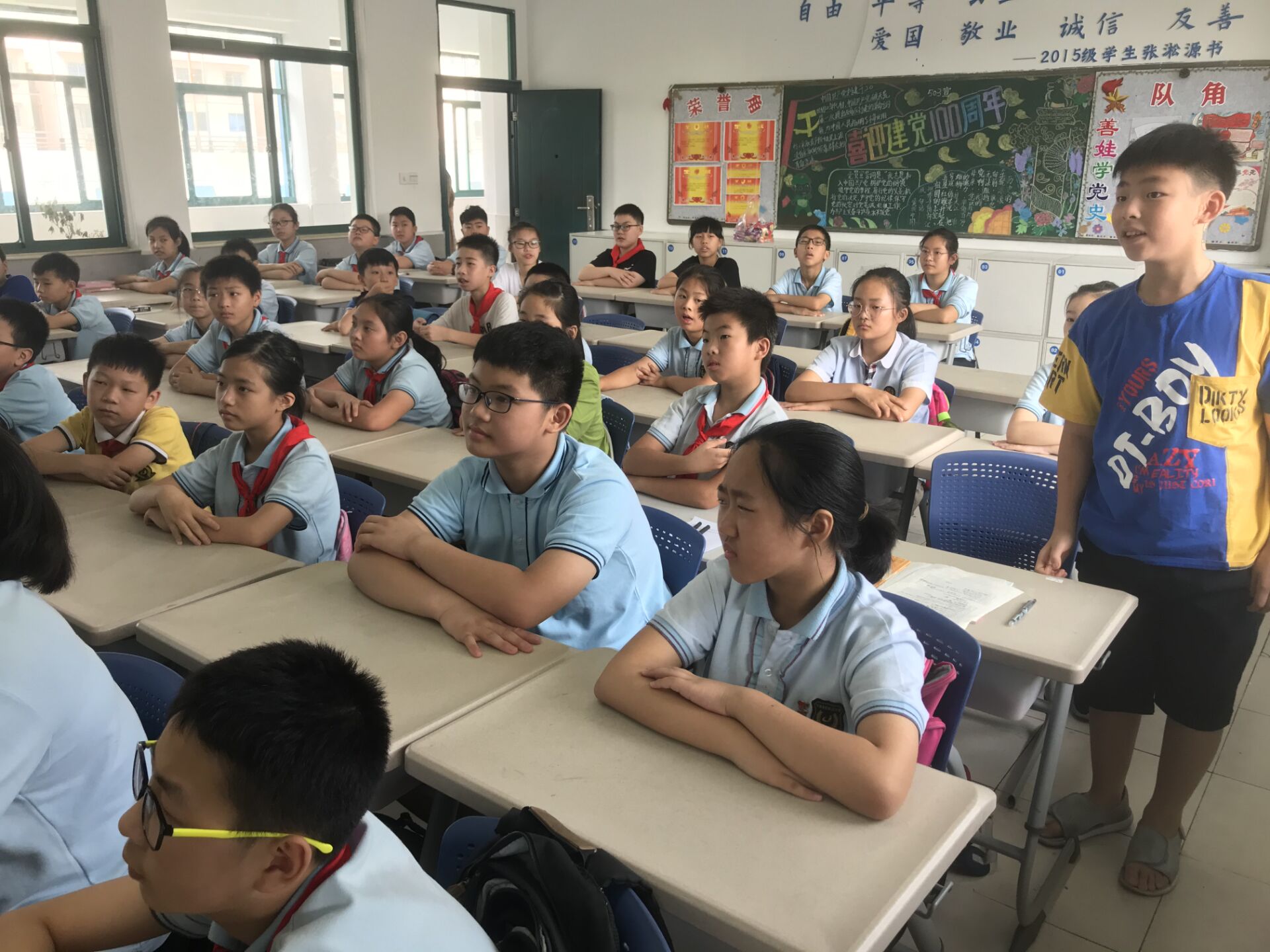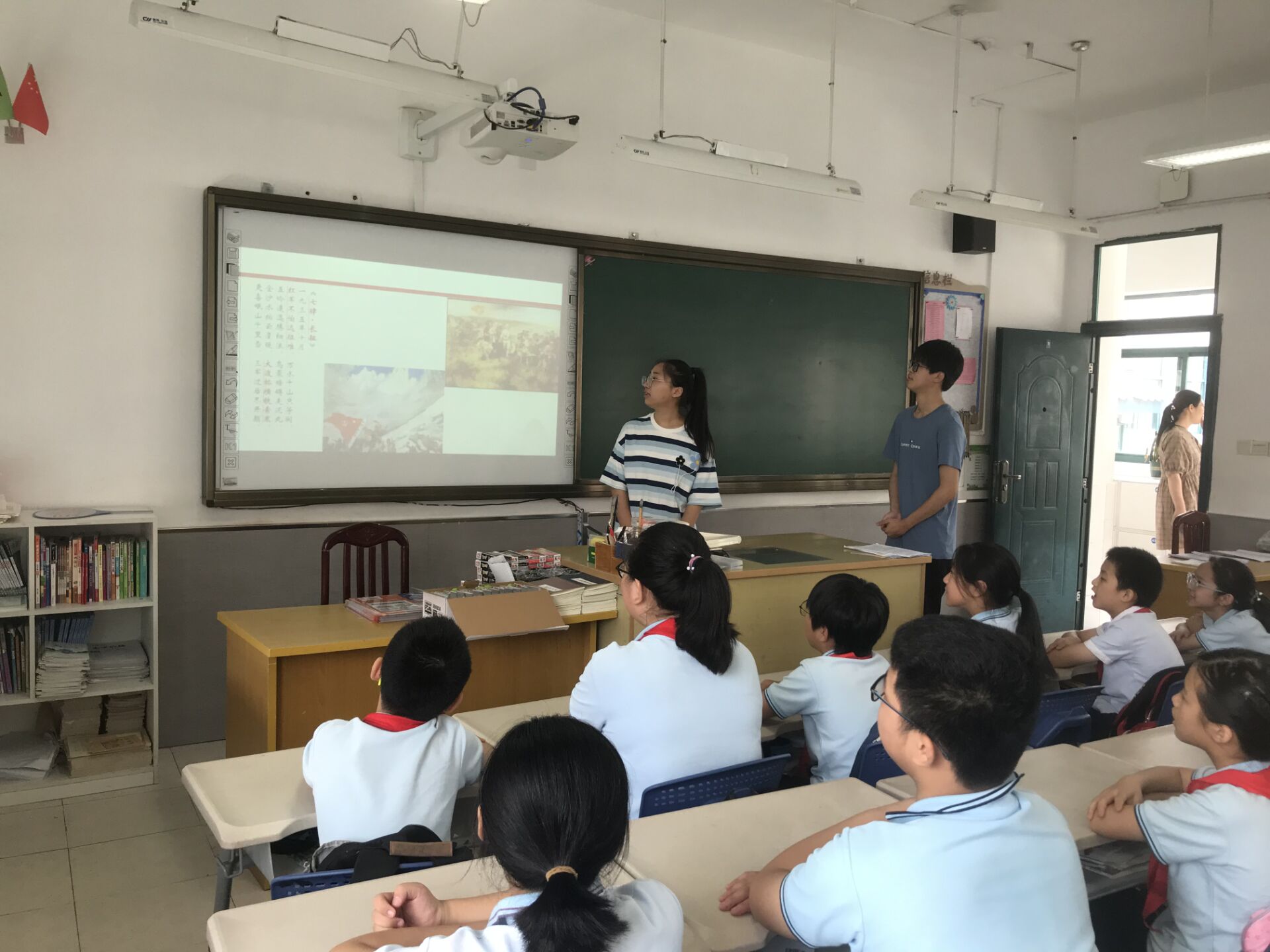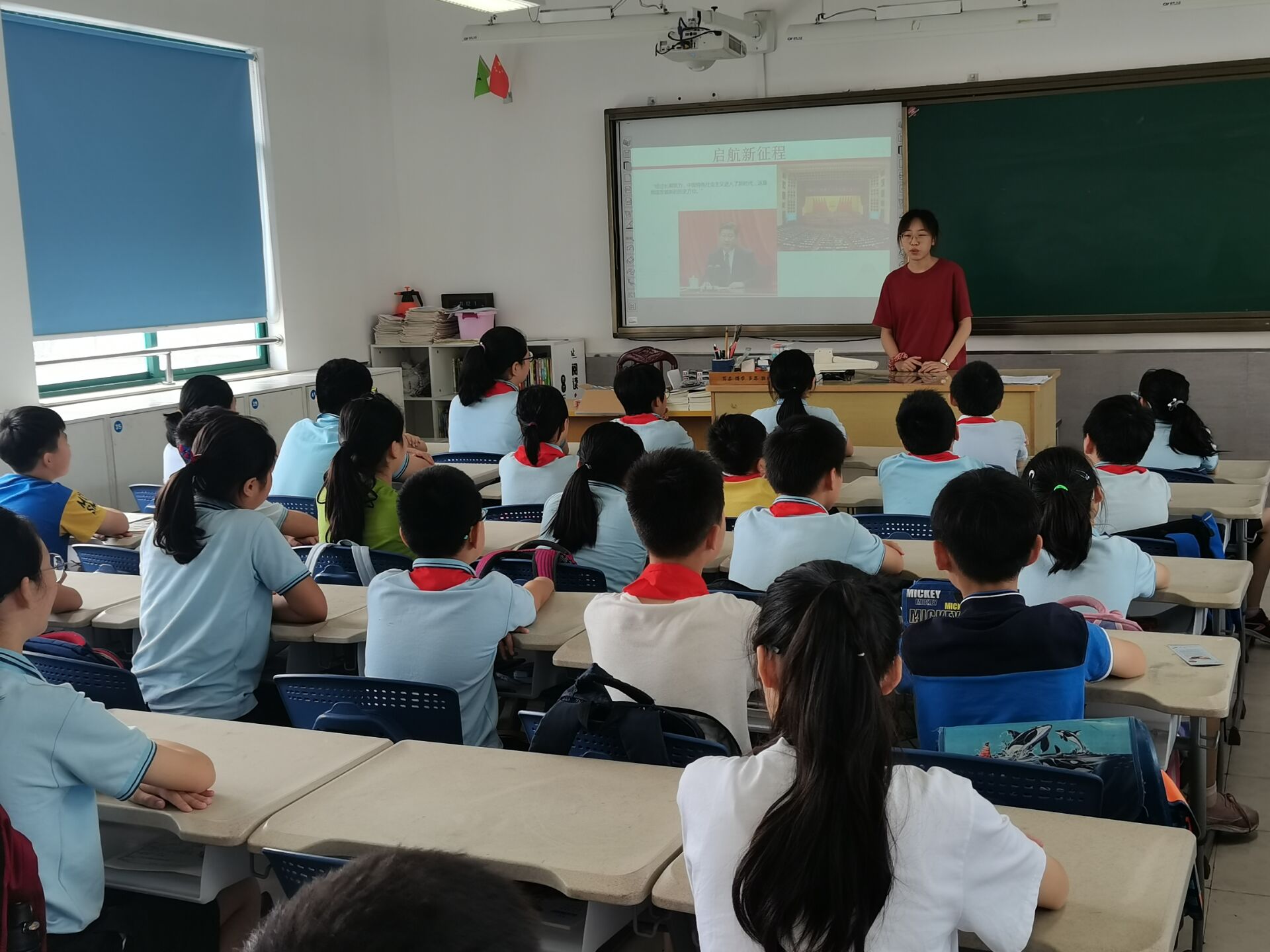 在“启航新征程”活动中,宣讲团分组前往各班,组织开展班会主题活动。在班会开始前,小组均以校园“红歌会”的形式带领学生们唱红色歌曲。演唱完毕,一组在班会期间组织学生集体观看《中国机长》、《中国医生》等电影片段,带领学生们感悟中国力量并从中获得国家荣誉感;另一组队员则给小朋友们讲述了神舟十二号背后的故事,介绍中国特色社会主义进入新时代后我国所取得的如军改、反腐、抗击疫情、航天发展等一系列成果,用党的实践创造和历史经验告诉孩子们应以崇仰之情、敬畏之心认真学习党的历史,从中汲取新的智慧和力量。在班会结束后,宣讲团分发了定制的红色明信片,鼓励学生们将自己看完电影、听完宣讲后的感受写在上面,并用心写下对自己的期待和对国家的祝福。