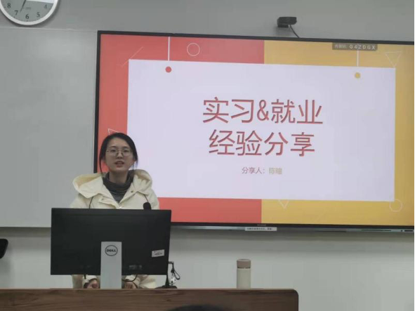 李雨然和陈瞳首先进行了实习与就业方面的经验分享。围绕实习工作的回顾、实习心得体会、就业经历三个方面,她们向同学们展开讲解,并从自己的亲身体会出发为同学们提供宝贵实用的就业经验与建议。李雨然表示,实习非常重要,在实习时,个人可以充分参与到课堂授课和班级管理中去,真实感受教师的状态,因此在实习过程中,自己的能力能够得到极大的锻炼和提升;除此之外,实习过程中能接触到各种不同的学生,获得大量的个案,一些学术教研工作也能够顺利展开。陈瞳提醒同学们,就业面试时,不盲目,多听多看多了解;笔试面试提前准备,不打没有准备的仗;面试需自信,扬长避短需牢记;重视实习,实现自我提升。