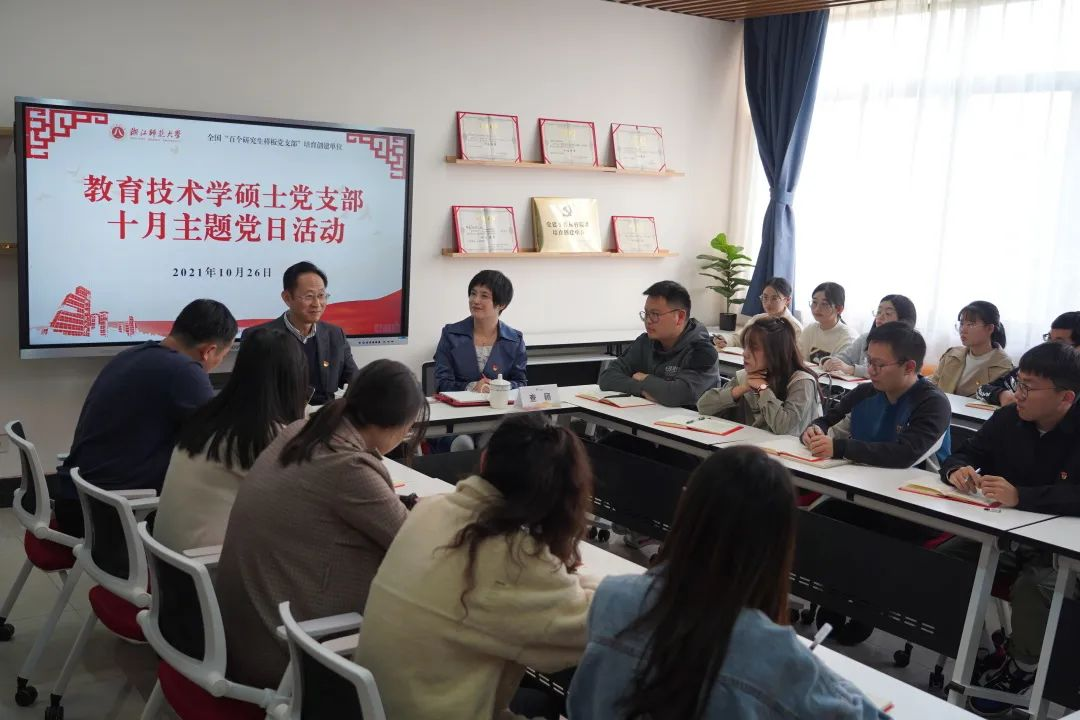 党建引领明方向,扬帆启航新征程。作为全国高校“百个研究生样板党支部”培育创建单位,教师教育学院教育技术学硕士党支部于10月26日在17-711党员教授工作室开展十月份主题党日活动,支部党建导师袁振国教授以自身体悟传递人生哲思,启迪青年党员们以社会价值为导,增强责任意识,充分发挥党员先锋模范作用和党支部战斗堡垒作用。教师教育学院党委书记查颖、党委副书记狄伟锋参加活动。
