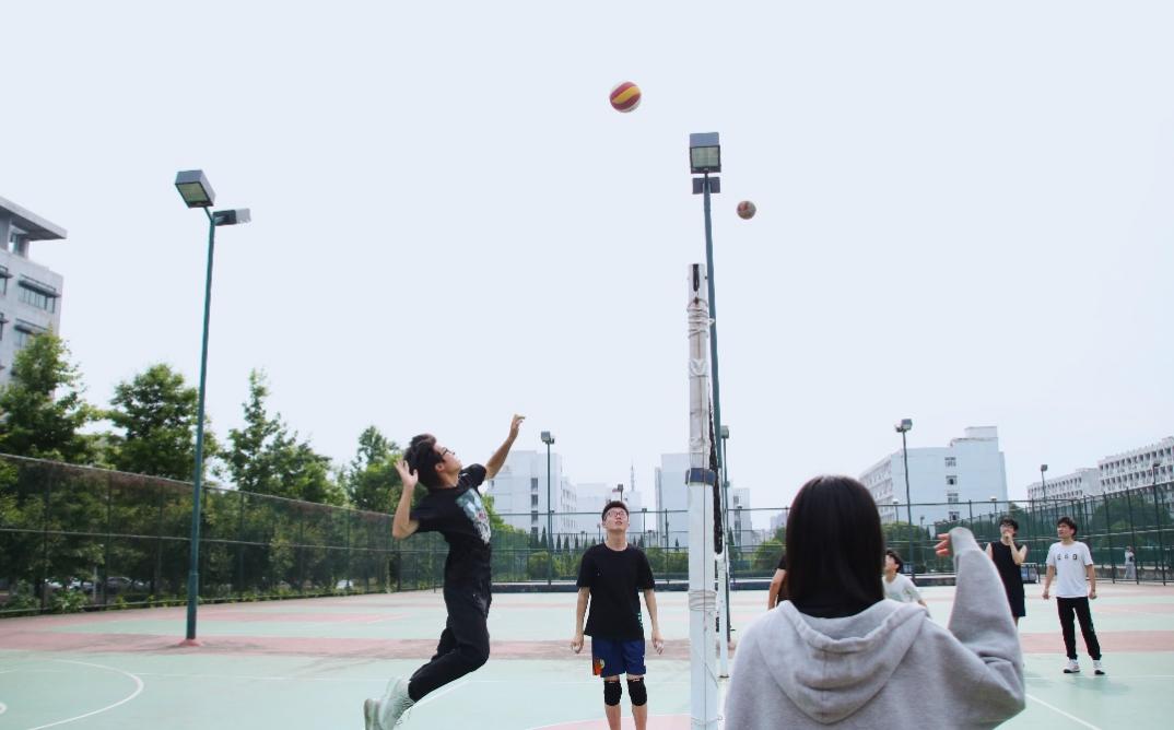 下午三点左右,两个学院的球队队员们就已在排球场上热身,为队员们加油打气的啦啦队也陆续到场。随着哨声一响,比赛正式开始!