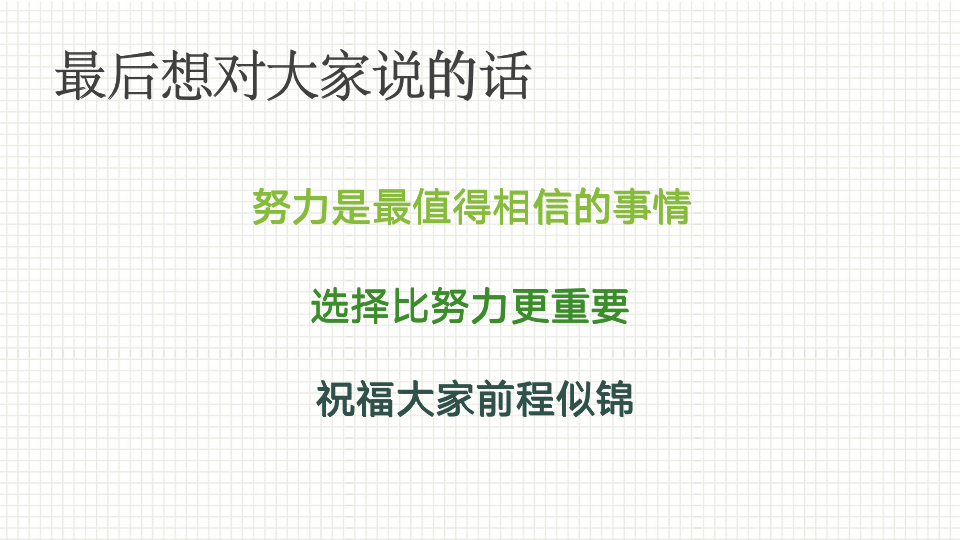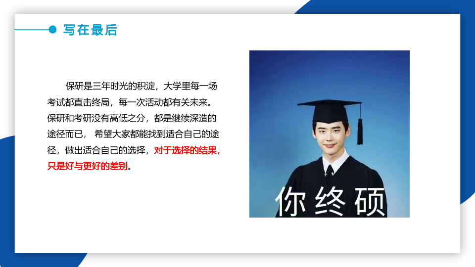 最后,陈怡慷慨地分享了她的推免“两大法宝”:一,同学们可以在各大公众号、保研论坛及目标院校官网上收集保研信息;二,在保研工程中要稳住心态。她建议同学们学会合作共赢,做好最坏的打算,并为大家送上了真挚的祝愿:“保研是三年时光的积淀,大学里每一场考试都直击终局,每一次活动都有关未来。保研和考研没有高低之分,都是继续深造的途径而已,希望大家都能找到适合自己的途径,做出适合自己的选择,对于选择的结果,只是好与更好的差别。”
