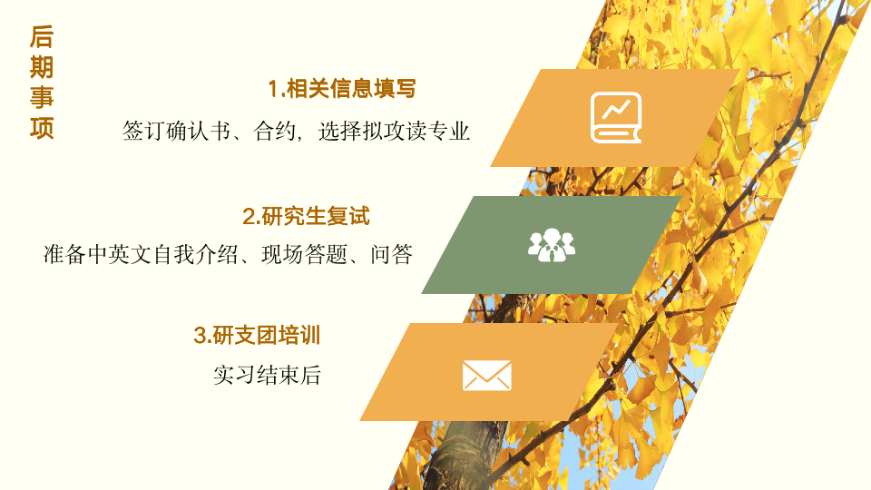 朱慧玲从“通知解读”“面试准备”“后期事项”三方面分享了她的保研经验。朱慧玲着重强调了面试方面的准备:自我介绍可围绕学生工作、学科竞赛、学习成绩、支教初心等内容展开;即席演讲/结构化面试则围绕支教初心、自我优劣势、教学机智等问题展开回答;现场问答要大方、从容、有逻辑。最后,她还向同学们分享了面试三原则:着装得体清爽,语言清晰有逻辑,行为大方从容。