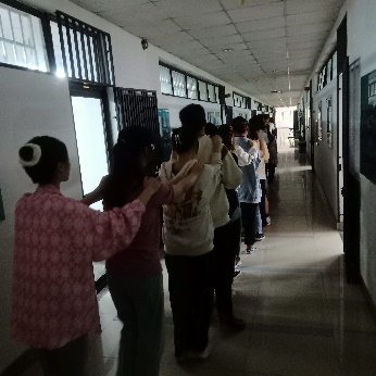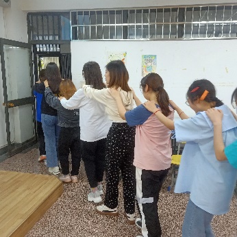 用沟通搭起心灵的桥梁——这是第二次的团辅,是一段建立信任的旅程。什么是信任?或许就是可以把背后托付给对方。在班长的带领下,身后闭着眼的同学们搭着身前同学的肩膀,在黑暗中勇敢地前行着,开呀开,一列长长的小火车就这样上路了。