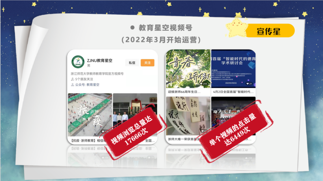 推文视频助宣传,教育风采展青春。一年内,“教育星空”微信公众号发布推文共205篇,其中15篇被国、省、市三级权威媒体录用,86篇被校级及其他媒体录用;其中,更有关于跨越三千公里与青海民族学校联动举办“山海情”活动的相关报道被新华网录用,浏览量达30.9万。同时,本学期才开始运营的教育学院视频号,已成为了新型“流量密码”。