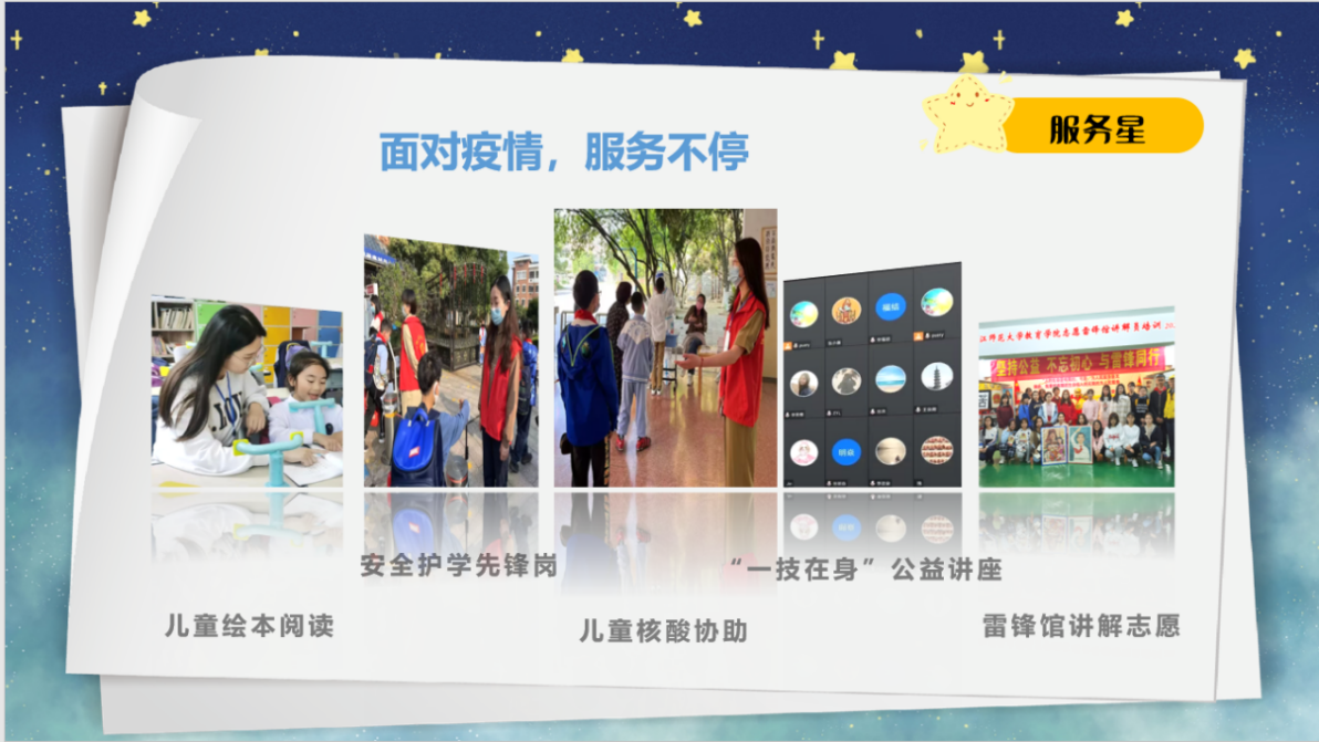 志愿服务行不停,教育情怀传温情。教育学院学生会结合专业打造“青”系教育志愿品牌,在抗疫“战场”后方设立多媒体技术咨询岗,搭建线上倾诉平台“聊愈森林”……“服务星”秉持着“我为同学办实事”的理念,开通线上线下多种沟通渠道,做到“怀恒心,展特长,怀大爱,尽所能”。