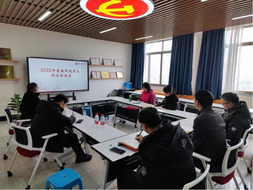 刘琴情汇报2022年支部建设情况,一是认真抓好组织建设,充分发挥支委会作用,规划、落实各项工作;二是积极发挥党员模范作用,结合专业特点,主动担当作为,服务师生群众。