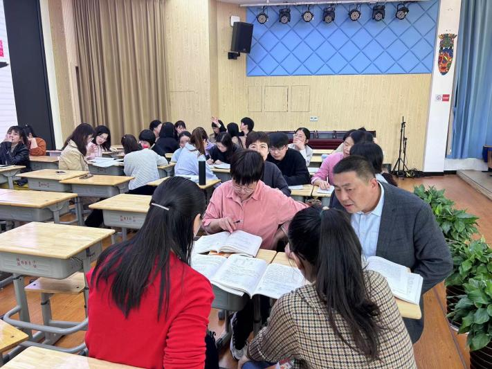 浙师大三名见习生上台参与卷入式教学研讨活动,学习借鉴优点,虚心提出疑惑并请教。张副对陈老师的课堂教学给予高度评价,也从深挖文本价值、发挥学生主体地位等角度对陈老师的课进行点评,认为应突出侧面描写,将把文本价值发挥到最大化,进行深入拓展,从课内走向课外。金副认为浙师大见习生观察细致入微,鼓励与指导老师积极沟通。本次常规语文教研互动多方参与,其各抒己见,肯定优点,指出不足,氛围融洽,其乐融融,共促课堂之发展。