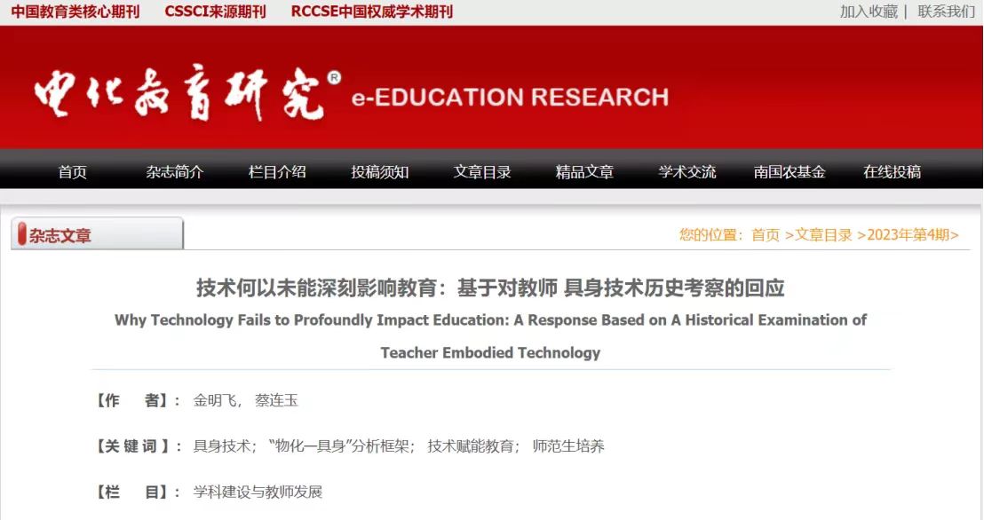 近日,教育学院高等教育学专业博士生金明飞与导师蔡连玉教授在《电化教育研究》2023年第4期上发表题为“技术何以未能深刻影响教育:基于对教师具身技术历史考察的回应”的研究论文。这是蔡连玉教授教育数字化转型理论研究团队的又一新成果,也是博士生金明飞同学2023年上半年发表的第二篇一级核心学术论文!