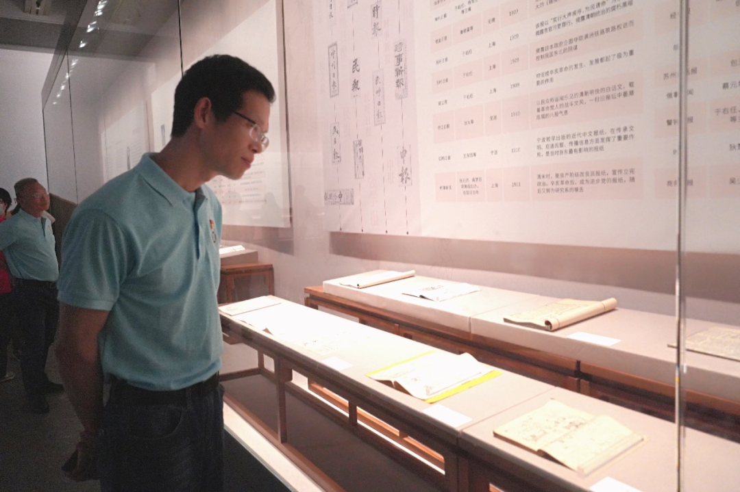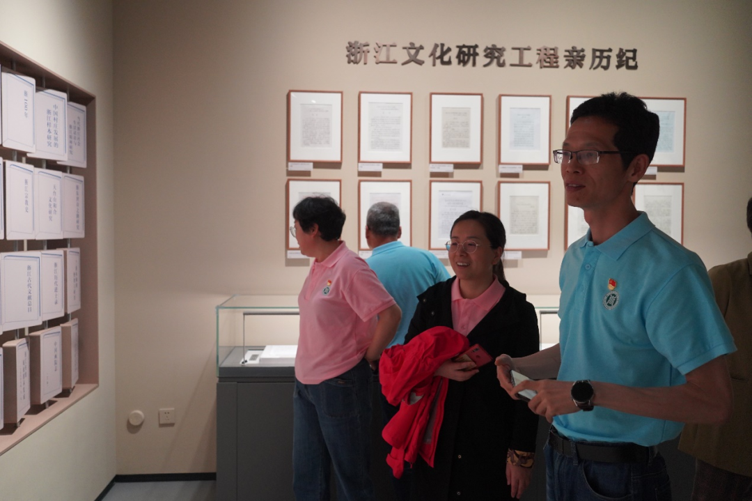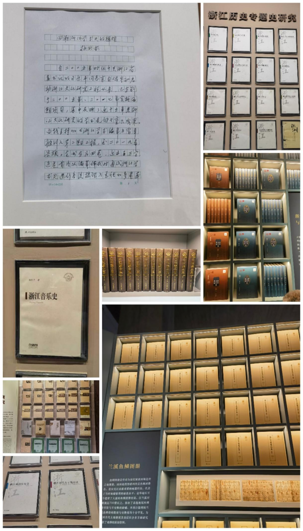在版本馆中,党员同志们还惊喜地发现其中蕴藏着众多浙师元素,比如有浙师大老书记梅新林教授的手稿《回溯浙江学术史的辉煌》,黄灵庚教授编著的《吕祖谦全集》,胡铁球、李义敏、张涌泉教授编著的大型地方档案文献丛书《兰溪鱼鳞图册合集》,陈开勇教授编著的《浙学未刊稿丛编》,吴民祥教授的专著《浙江近代女子教育史》,杨和平教授的专著《浙江音乐史》,陈国灿教授的专著《浙江城镇发展史》等。展架上一本本出自浙师人的专著、编著,无不凝聚着浙师人的智慧与力量,让作为浙师一份子的我们倍感骄傲、自豪。