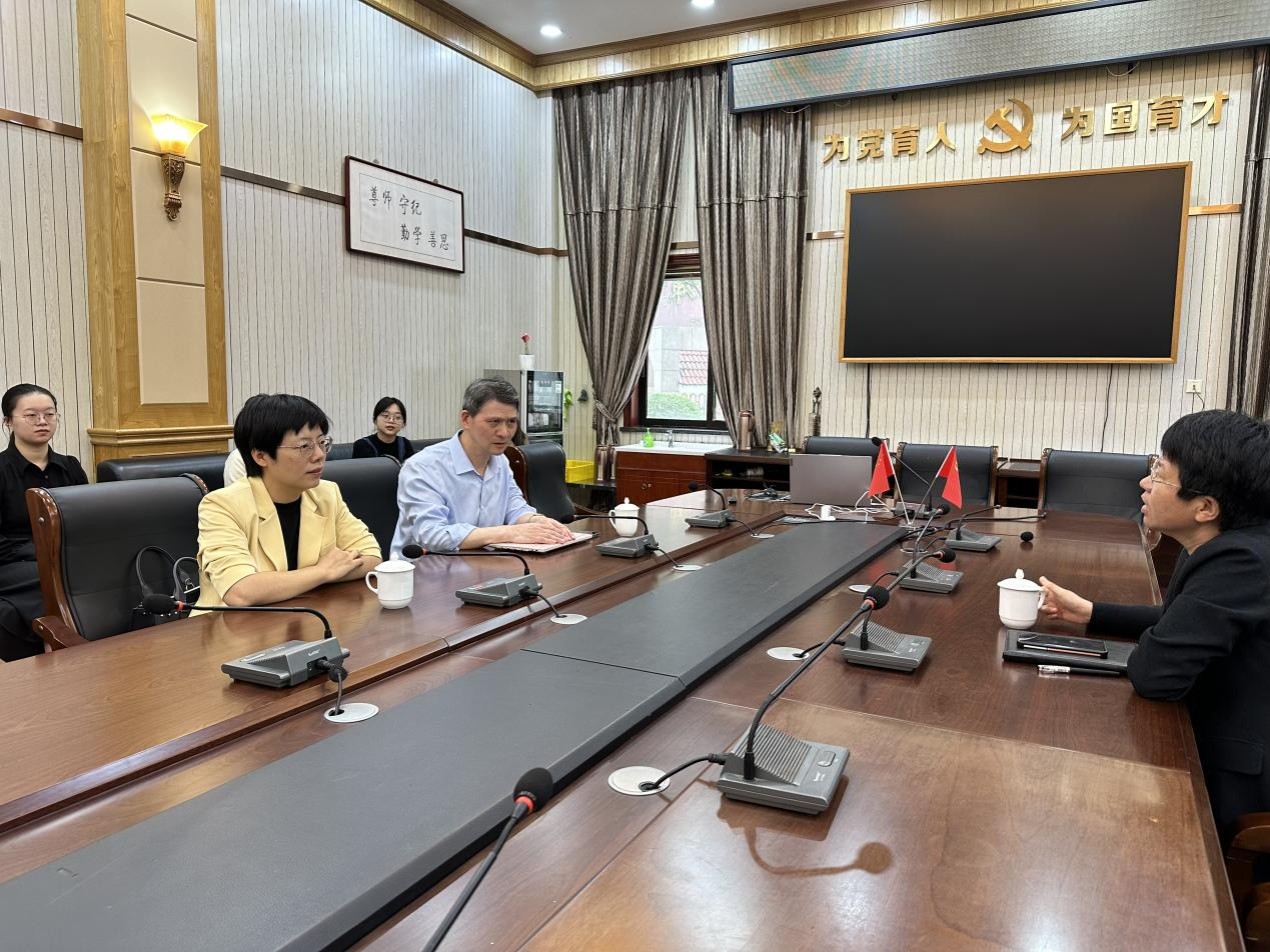 走访第三站是永康中学。教育学院一行和实习同学在永康中学立功楼八楼党建会议室召开会议。