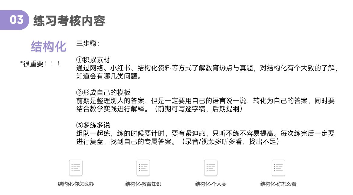 在讲解考核内容时,应佳怡强调练习结构化面试的重要性,她认为可以通过积累教育热点素材、整理个性化答案、组队练习、复盘反思等方式,增强应答、应变能力,从而在面试中展现游刃有余的状态。