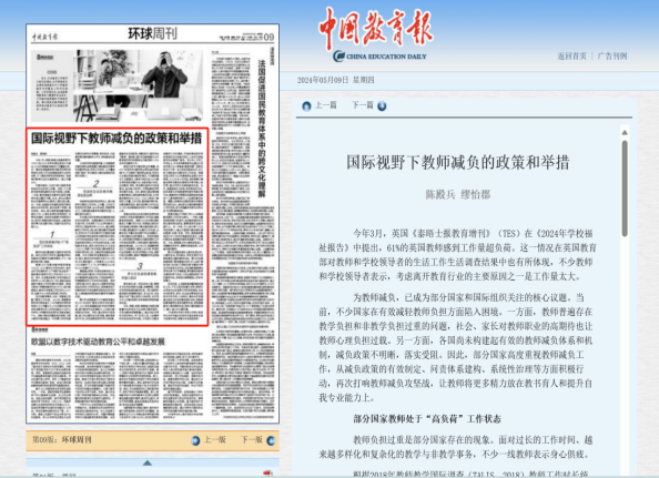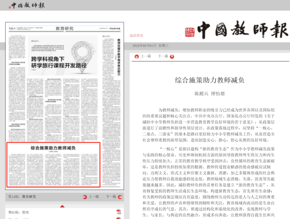 近日,中央教育工作领导小组印发通知,再次部署中小学教师减负工作。kaiyun开云官方网页版陈殿兵副教授、硕士生缪怡郡在《中国教育报》《中国教师报》刊发教师减负系列署名文章助力教师减负的政策与实践努力,让教师能安心、精心、舒心地从教,促进其专业可持续发展和教育高质量发展。