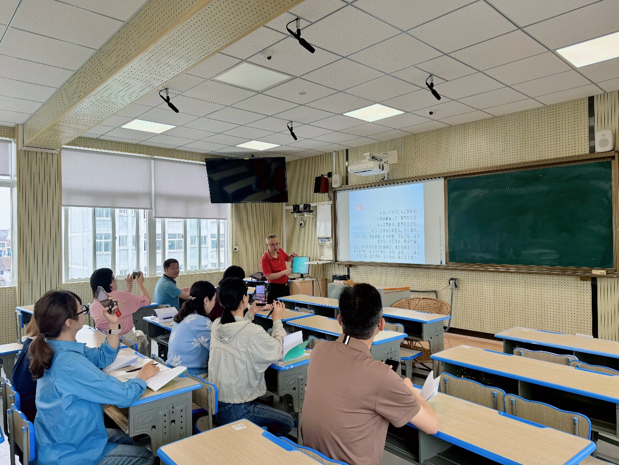 在初中英语教研会上,骆巧丽做了题为“英文课程设计与优质课案分析”的讲座。她基于义务教育阶段课程标准,从支架教学法、产出导向法、英语学习活动观等理论视角,对初中英语学科的教学设计、文本解读、活动组织、课堂评价以及作业布置等方面内容进行了系统介绍,并结合优质教学课例进行了剖析与诠释。