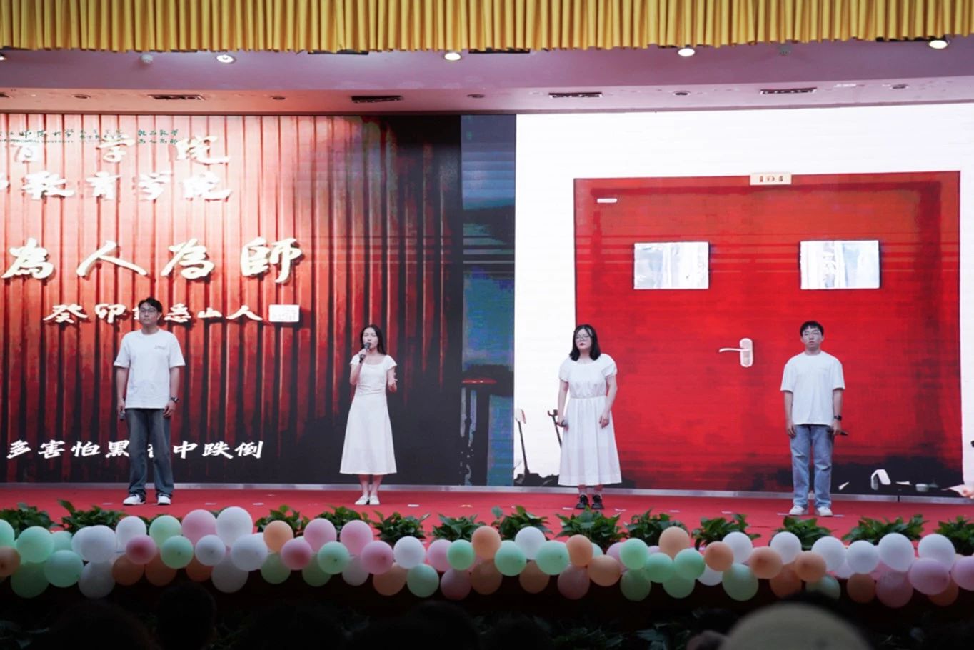 毕业生们在导师、班主任的带领下走上红毯,跨过教育之门,并在签名墙前合影留念。告别昔日的稚嫩,留下藏匿温情的四季,此刻,大家就让工作人员把美好定格在瞬间。场内视频播放着大家在浙师的点点滴滴,帧帧光影是凝结在心头的笑容与泪水。