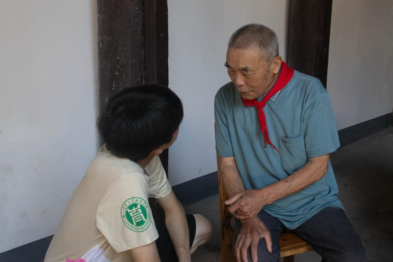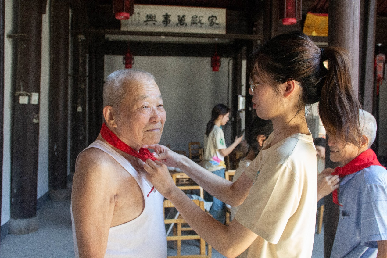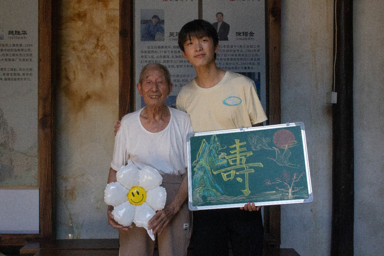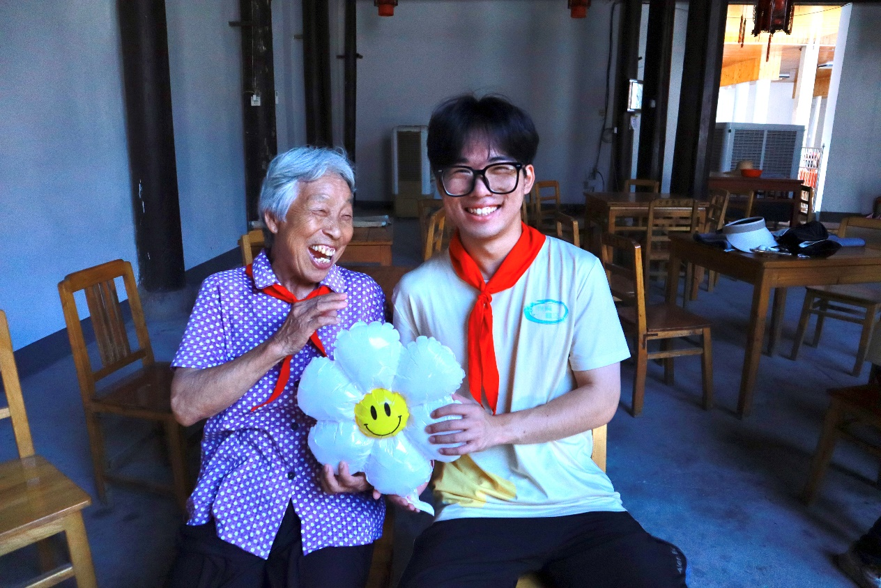 拍摄前,实践队员和老人们亲切交谈,了解他们的身体和生活情况。随后,有的队员帮助爷爷奶奶整理头发、衣着,有的为他们系上红领巾,有的准备好卡通气球以及写有“寿”字的小黑板。拍摄过程中,队员们定格老人们笑的瞬间,一张张温馨可爱的照片完成。