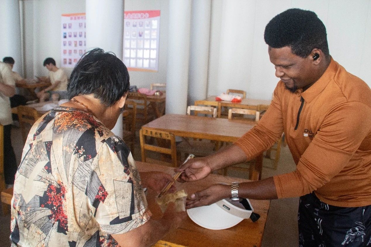 临近中午,实践队员们来到村里的居家养老服务中心——福寿堂。他们将一同为在这里用餐的老人包饺子,用心用情让老人们感受到关怀和温暖。摊皮、放馅、捏合,每一步都充满了中华传统饮食文化的韵味。在中国学生的帮助下,留学生包饺子的手法愈发娴熟。不多时,一盘盘实践队员包的饺子便摆满了桌面。