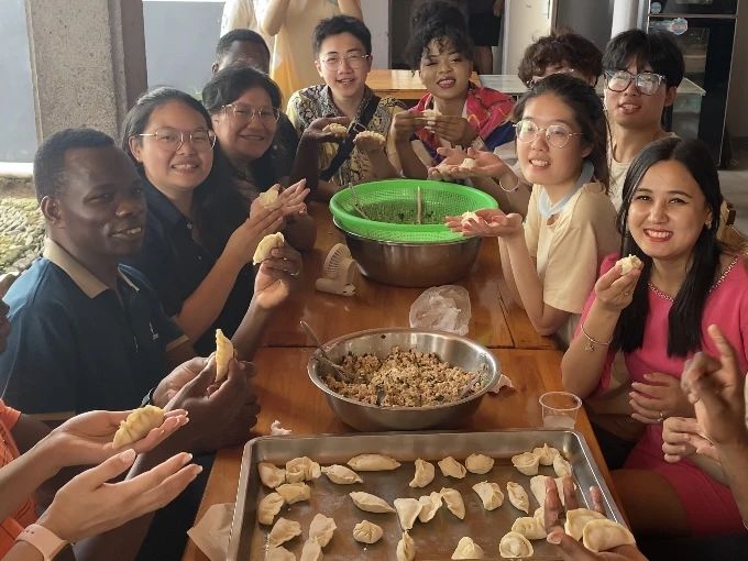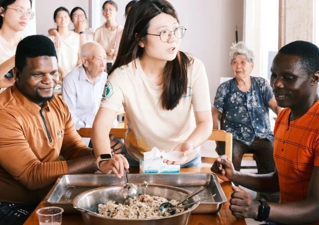 实践队的中外学生一起将这份来自不同国家的温情传递给村里的老人们。屋内众人围坐一堂,聊着家常,包着饺子,其乐融融。期间,留学生们深入了解了康养文化,并对中国的“孝”文化有了新的感悟。
