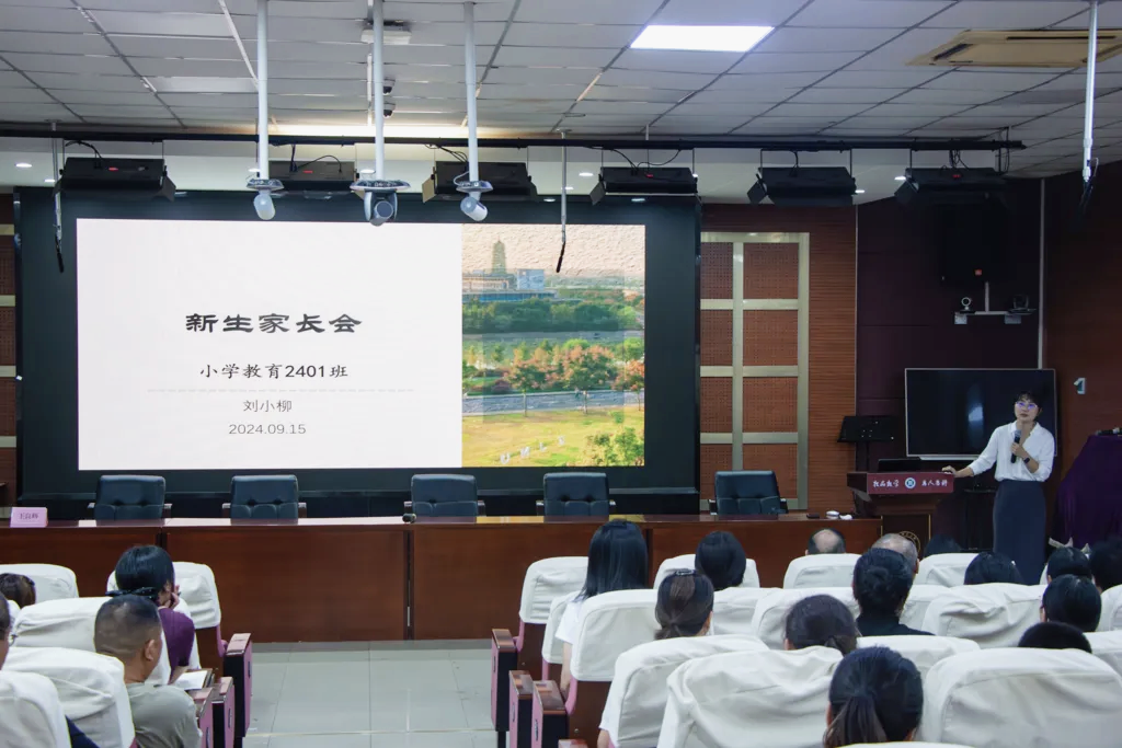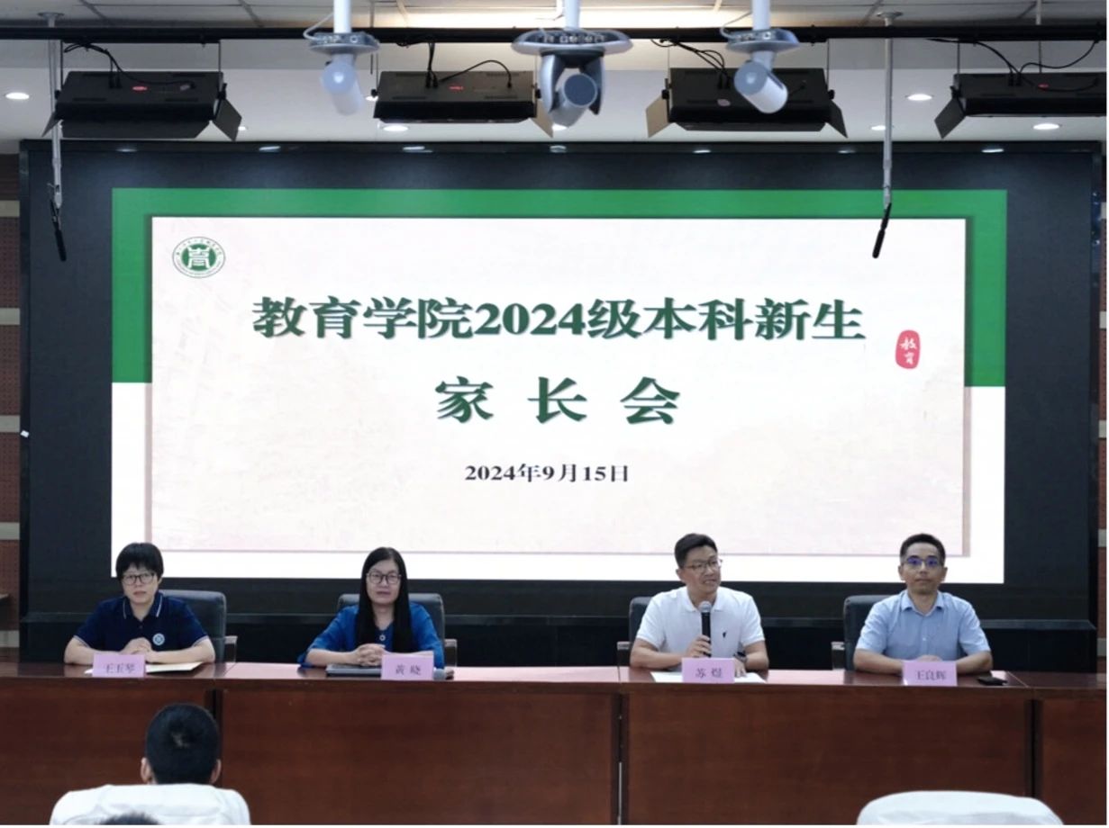 9月15日下午,教育学院于17幢112报告厅召开2024级本科新生家长会。学院院长黄晓、党委书记苏煜、党委副书记王玉琴、副院长王良辉等出席本次会议,各系系主任、科室主任、新生班班主任、辅导员和新生家长到场参与交流。