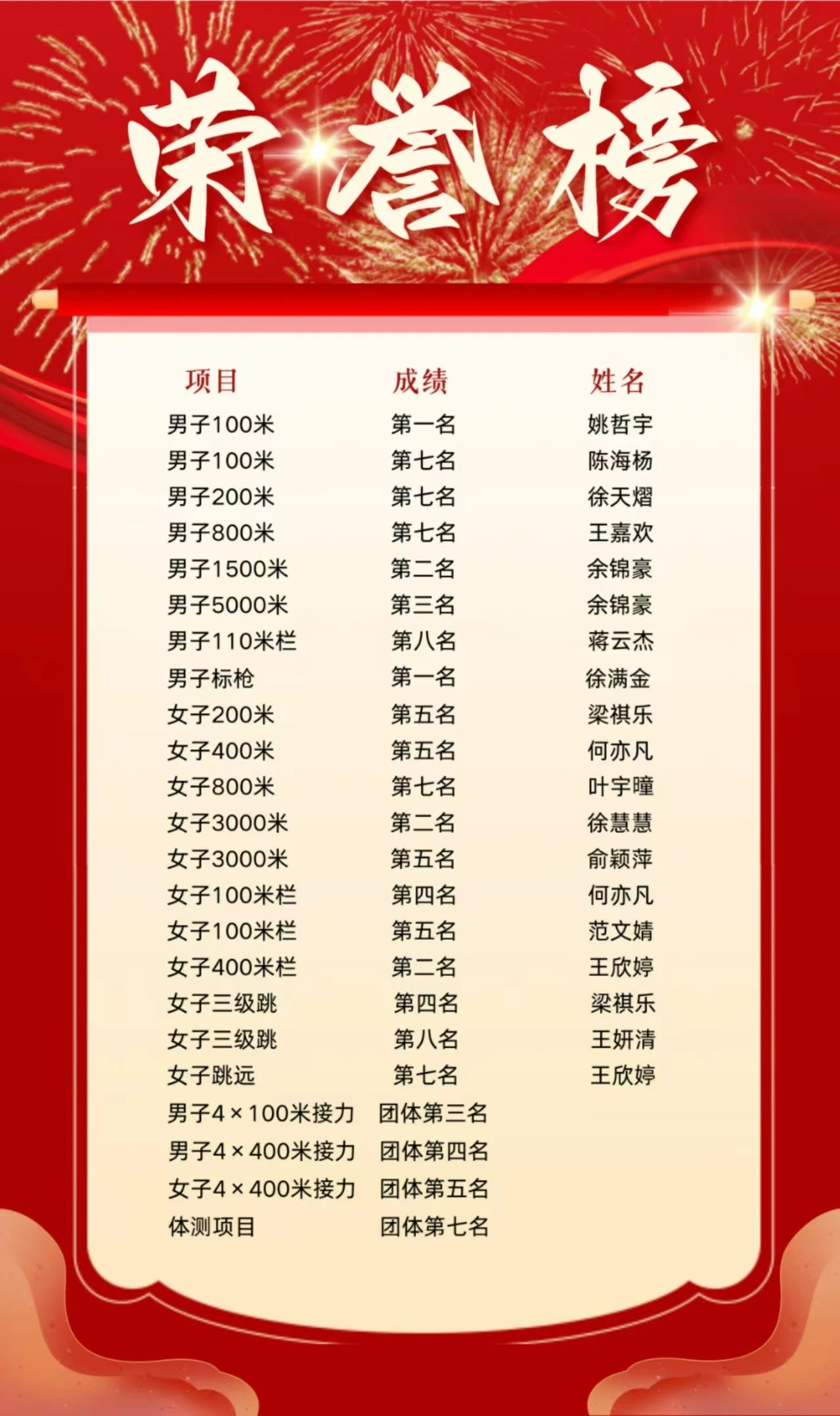 细雨绵绵,浇灭不了运动员们昂扬的斗志。在个人竞技项目中,姚哲宇高歌猛进,在男子甲组100米比赛中跑出“教育人”的加速度,斩获冠军。握持、助跑、起投……,徐满金蓄力一掷,在男子标枪比赛中一举夺冠。在女子400米跨栏比赛中,王欣婷在一次次的起跳与落地之间,棋逢对手,摘得亚军。在体力与意志力双重磨练的长跑比赛中,徐慧慧喜夺女子3000米亚军,余锦豪以优异的成绩摘得男子1500米亚军、男子5000米季军。