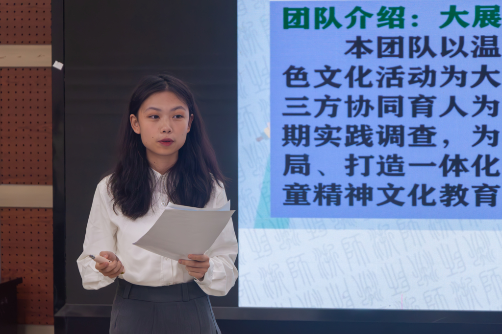 在团队实践成果展示环节,“教育星空”暑期社会实践队围绕“两山理论”、“康养文化”和“科普教育”三条主线,探索白沙溪幸福乡村建设。通过举办科普游园会、宣传“酸茶文化”、拍摄“最美笑容”、与村民共包爱心饺等活动,以实际行动为村民营造起温馨、活力、充满文化气息的幸福氛围;“瓯艺童心”手工非遗实践队“心怀乡土恩情,滋养美育劳育”,围绕“走出去”“担上肩”“动起来”,实践小队寻访博物馆文化馆、体验苍南文化馆讲解工作……将对瓯越非遗文化的热爱融入小学美育劳动教育体系,让瓯越非遗在稚嫩巧手中熠熠生辉!
