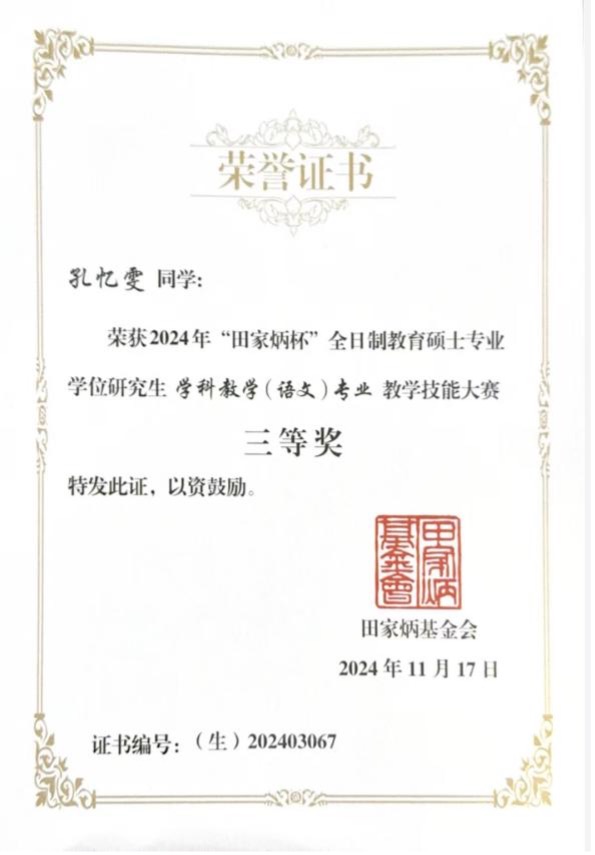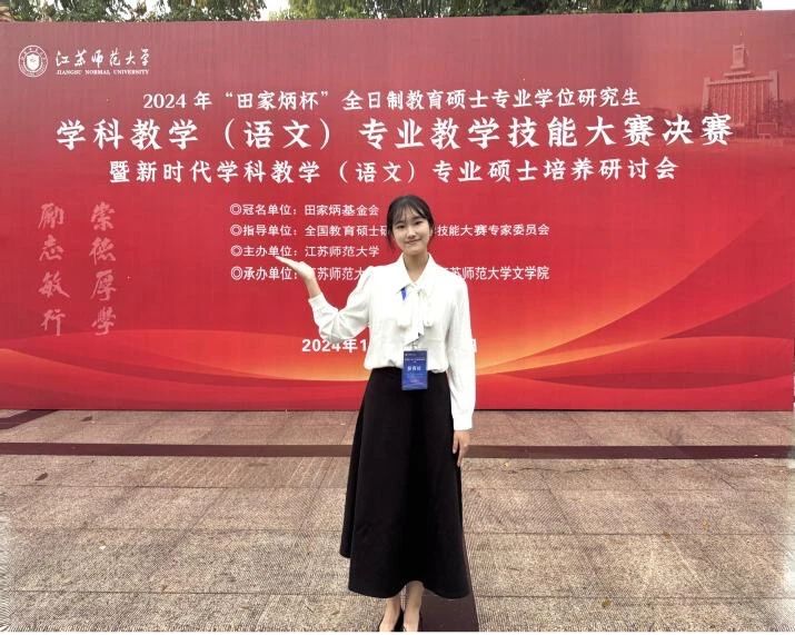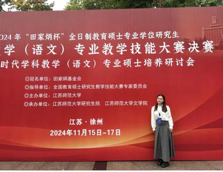 11月15-17日,2024年全国“田家炳杯”全日制教育硕士专业学位研究生学科教学(语文)专业教学技能大赛决赛在江苏师范大学举办,我院两名学生入围决赛,任睿老师带队参与,通过激烈的竞争,李梦琪获得二等奖,孔忆雯获得三等奖,俞向军老师获得优秀指导教师奖。