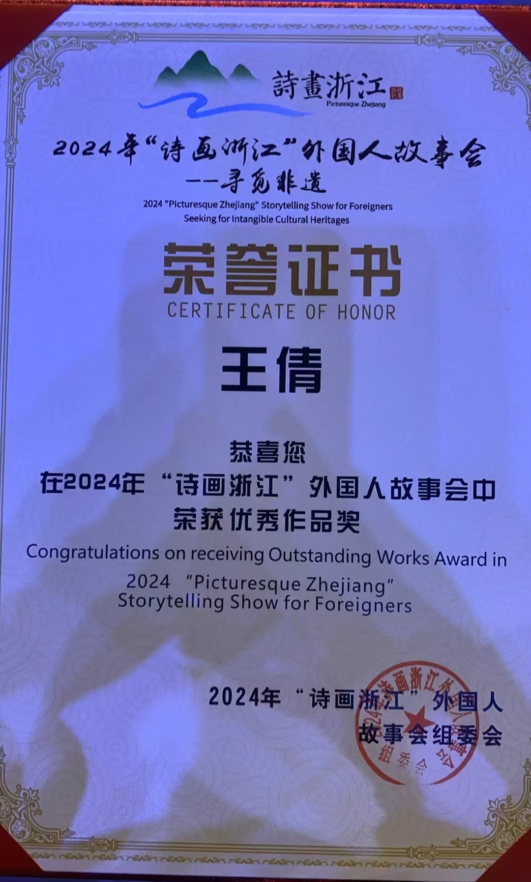 在2024年“诗画浙江”外国人故事会——寻觅非遗中获奖是一次深感满足且难以忘怀的经历。当我站在舞台上手捧奖杯时,内心充满了感激和开心,同时也感受到继续弘扬中国文化、特别是浙江丰富传统文化的责任感。
