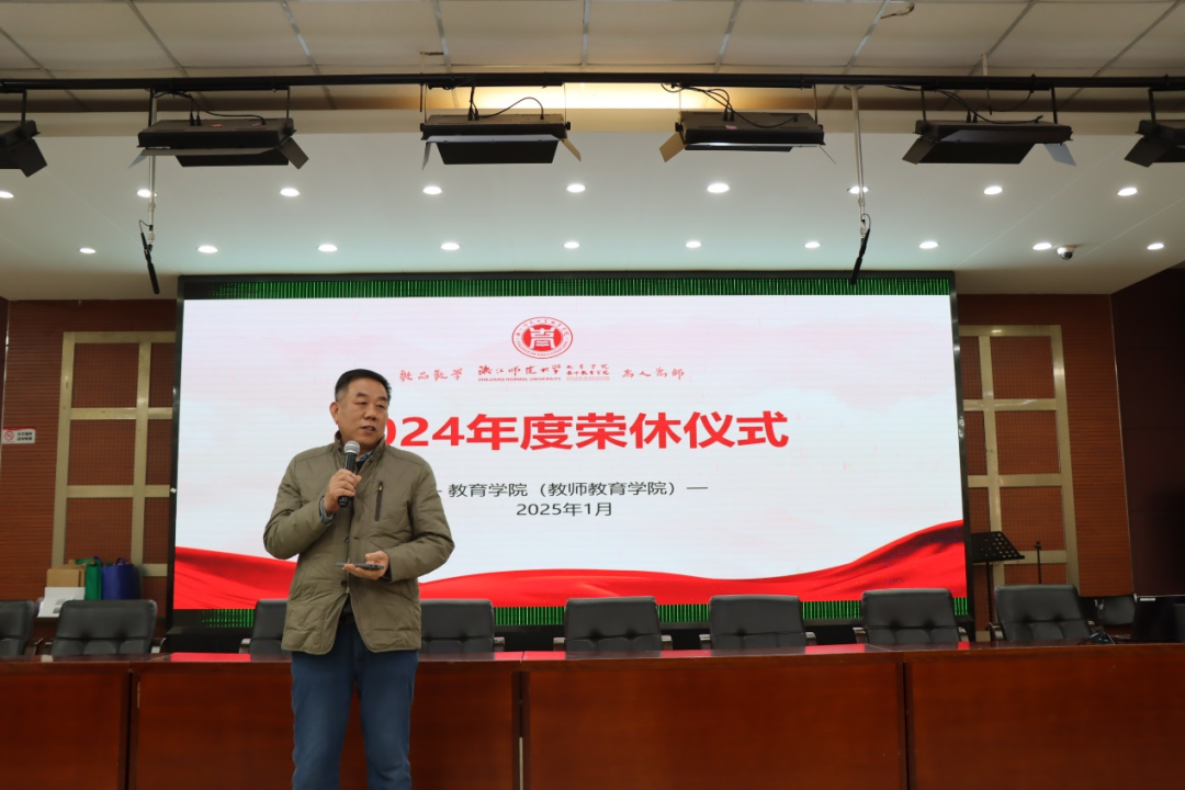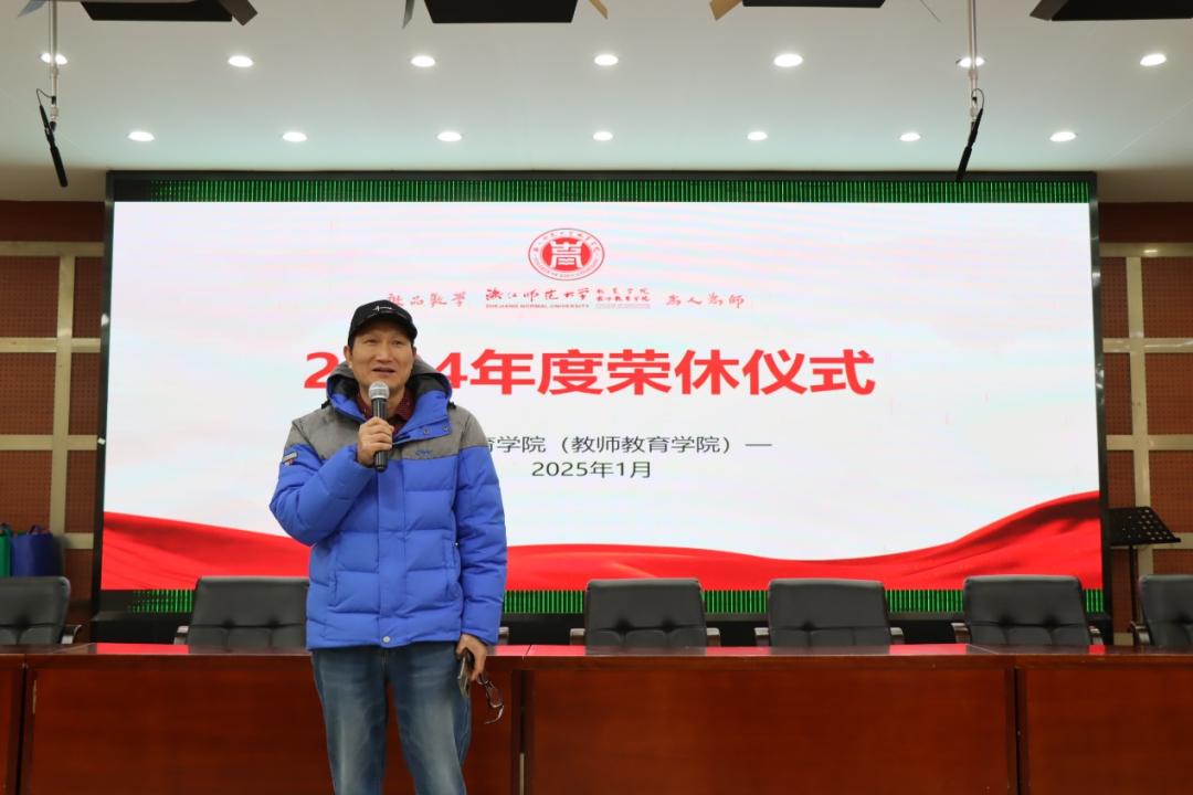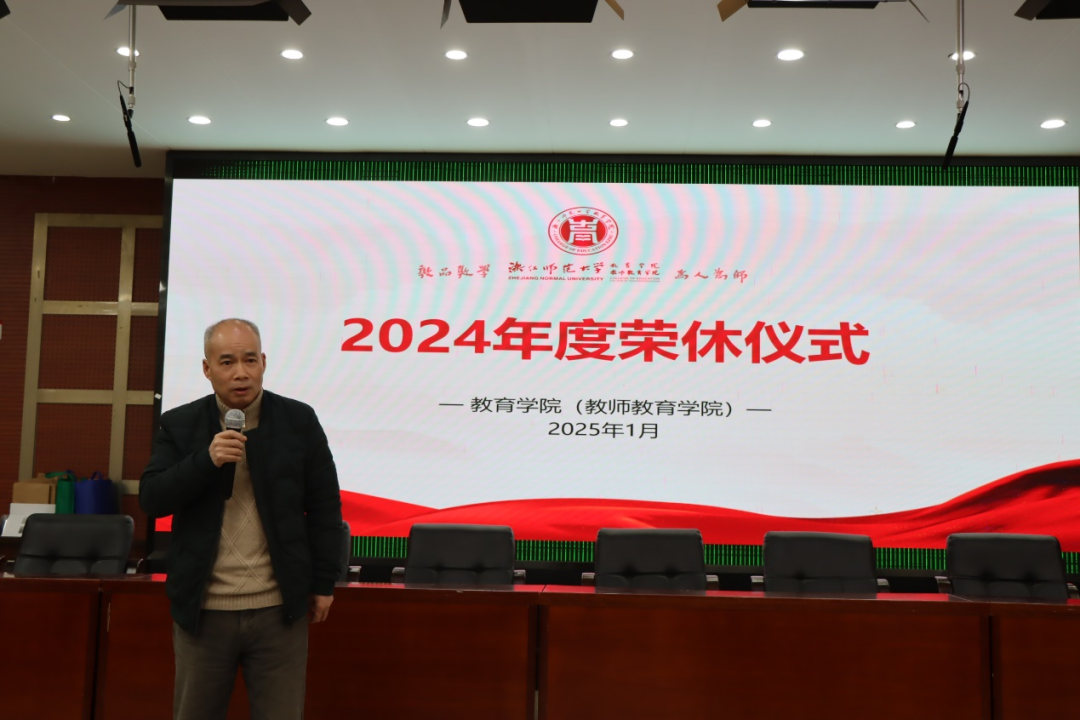 傅建明老师回忆起自身从教经历,满怀感激地感谢30多年工作过程中领导的宽容与同事的理解,这些年从教经历让他深刻感悟到教育的本质,也让他真切感受到教书育人的快乐。卢伟老师诚挚感谢学院精心筹备的荣休仪式,为其职业生涯画上了圆满句号,他感慨自身在金华40年的工作经历,亲眼见证了教育学院从无到有、从有到强的华丽蜕变。陈伟强老师深情回顾了自己3段工作的美好时光,感叹岁月如梭,感慨自己有幸参与并见证了教育学院的高质量发展历程,并衷心祝愿各位老师幸福快乐。