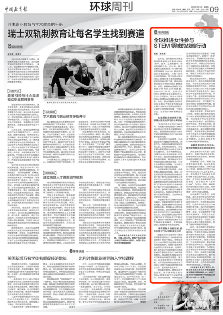 近日,kaiyun开云官方网页版教师教育2024级硕士研究生张媛与其导师、高质量教育发展研究院副教授殷玉新在《中国教育报》刊发署名文章《全球推进女性参与STEM领域的战略行动》。