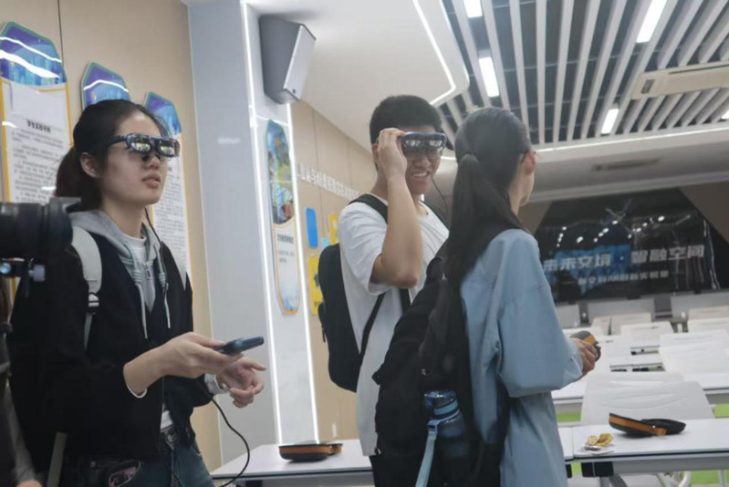 活动最后,同学们走进AR创新实验室一探究竟。作为承载未来教育理念的创新空间,实验室配备了特制的AR眼镜。教师借助这一设备开展沉浸式教学,不仅打破了传统课堂的边界,更以生动直观的教学场景,让抽象知识“跃然眼前”,生动诠释了“技术赋能教育”的现代理念。