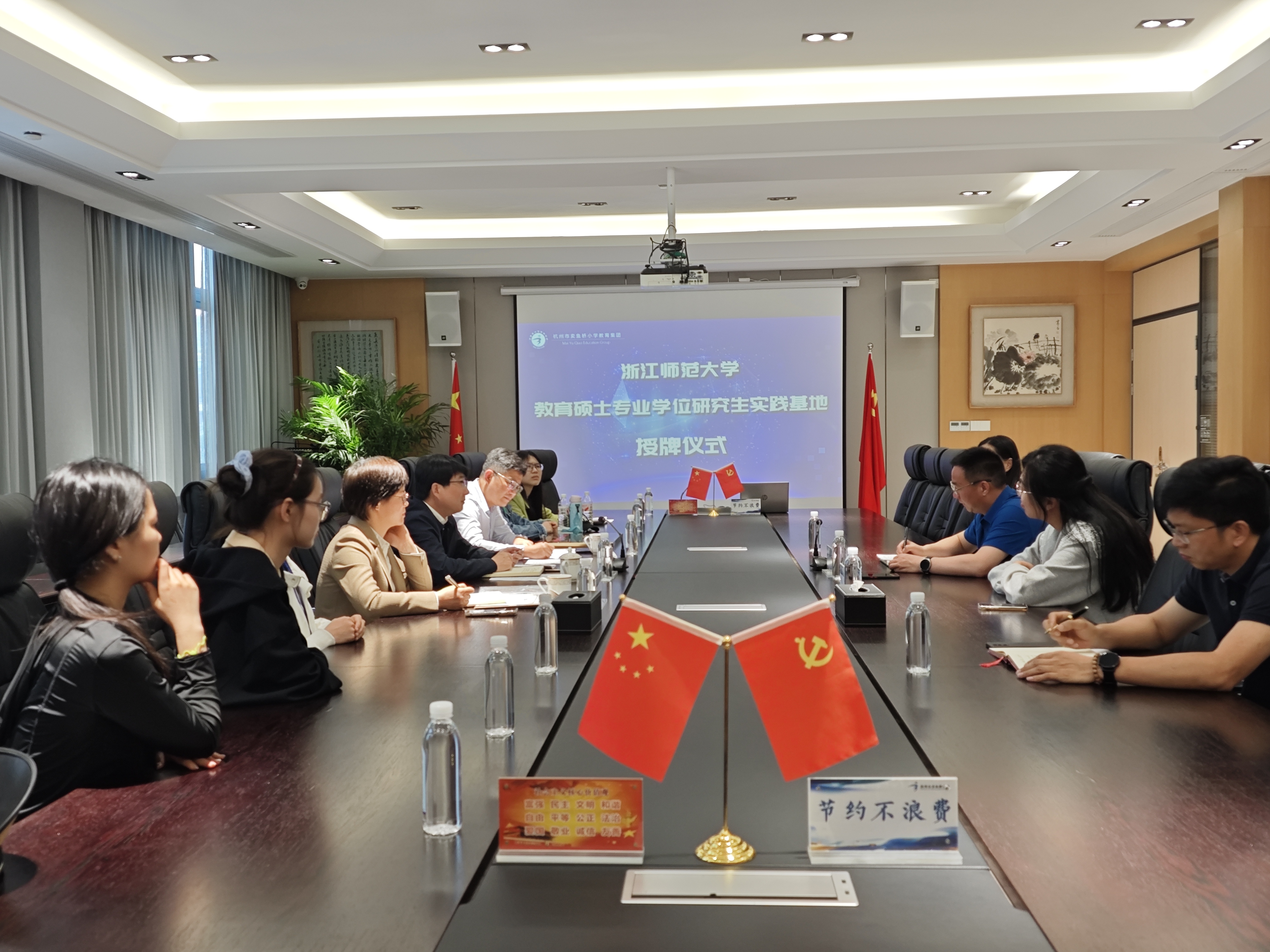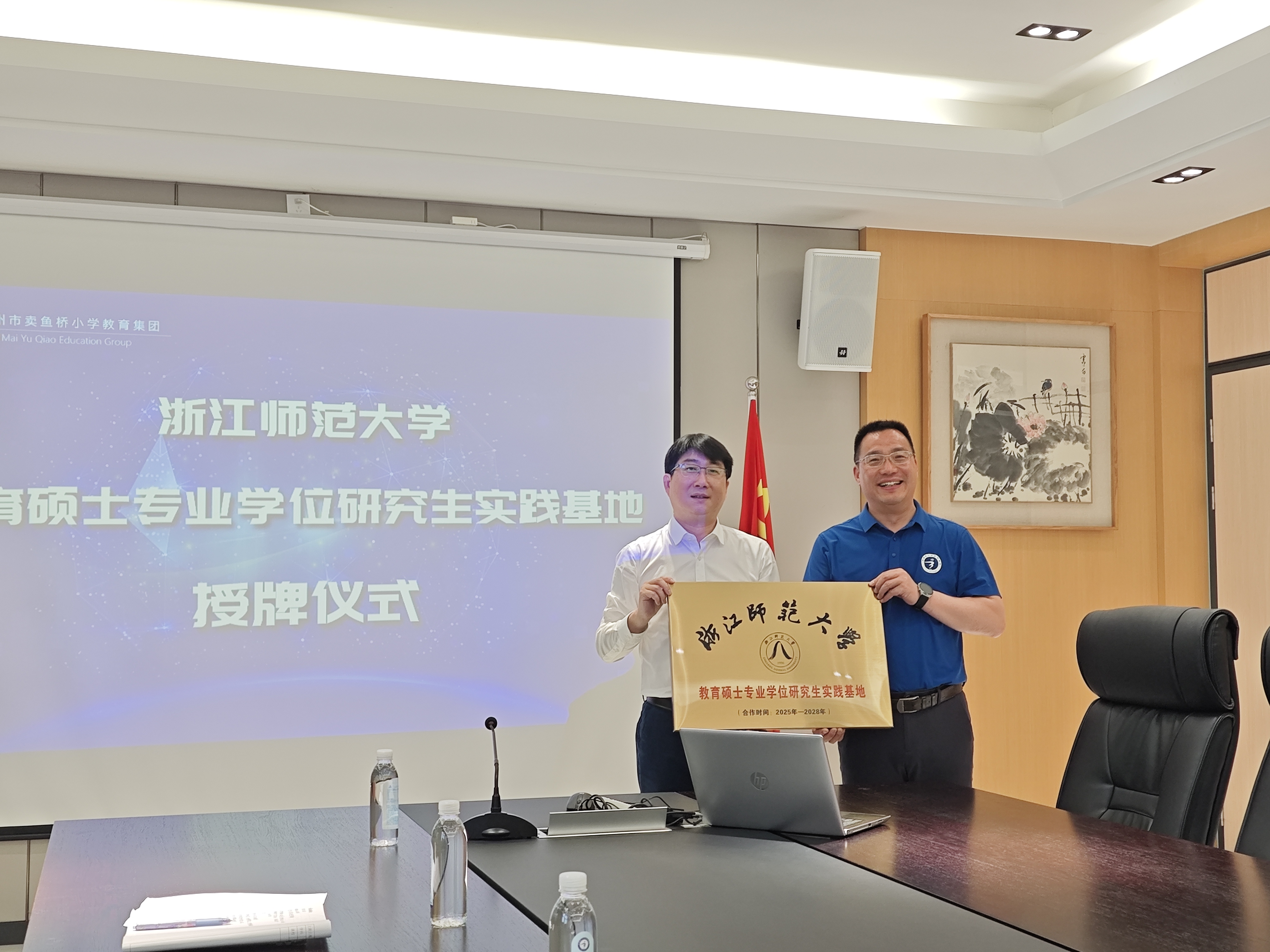 林一钢代表浙江师范大学对卖鱼桥小学的大力支持表示衷心感谢,并向罗才军校长授予“浙江师范大学教育硕士专业学位研究生实践基地”铜牌。林一钢表示,希望未来卖鱼桥小学能提供更多的实习名额,让更多的优秀硕士生来到卖小,扎根实践沃土,开阔眼界,提升专业技能;其次,他提出要加强两校合作,建立常态化的教研交流机制,整合高校的学术优势和小学的实践资源,形成高校与小学的协同育人机制,共同为培养新时代小学优秀教师贡献力量;最后,他期望同学们能够珍惜在卖鱼桥小学的实践机会,虚心学习,积极实践,为今后从事教育工作积累丰富的经验。