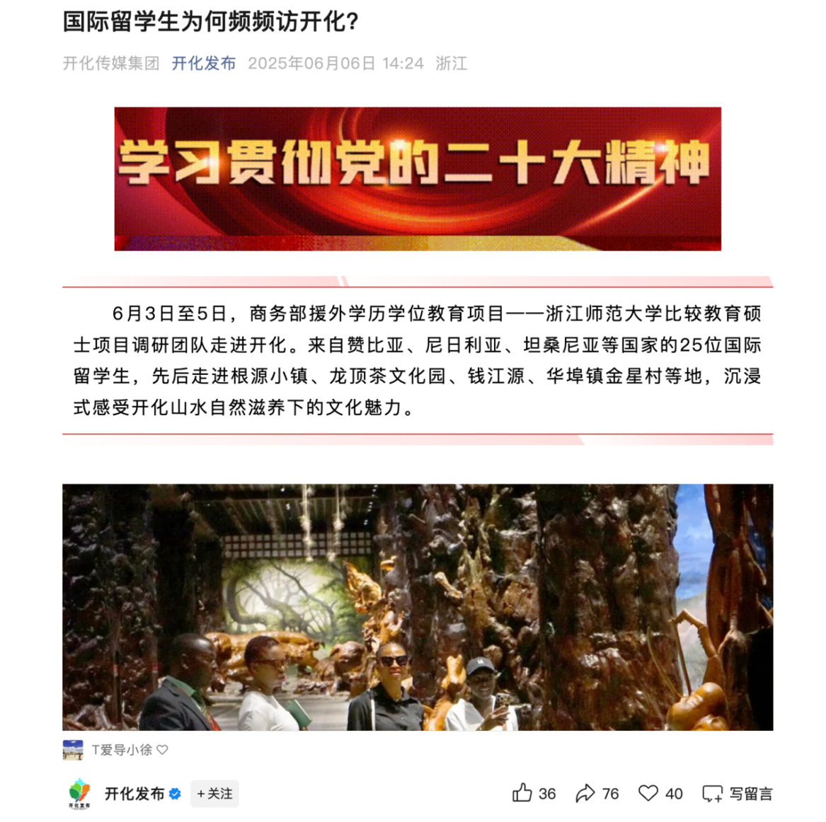 此次开化之行,不仅是知识的传递,更是通过实地调研,让留学生在真实的中国场景中理解“创新、协调、绿色、开放、共享”的新发展理念。留学生们在根雕的纹理中触摸中国传统工艺的温度,在茶园的氤氲里感知乡村产业的脉动,更在县域教育现场看到中国教育均衡发展、服务本地人民的实践路径。这些立体的“中国故事”,不仅为留学生提供了可借鉴的发展范例,更在跨文明对话中播撒下“发展共同体”的种子。