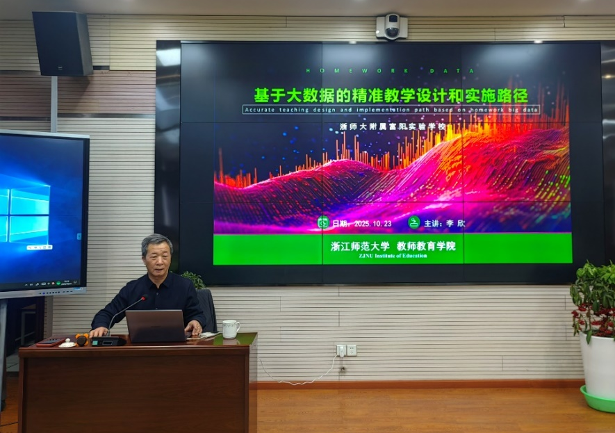 10月23日,外派专家李欣教授赴浙师大附属富阳实验学校,应邀在“儒雅学堂”专题活动中作题为《基于大数据的精准教学设计与实施路径》的专题讲座。讲座围绕如何利用数据驱动教学决策展开,重点阐述了关注个体差异、强化过程性评价、实现即时反馈与动态调整等核心路径,为提升教学精准性与育人实效提供了专业引领。