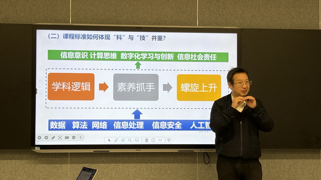 李锋教授在分享中指出,当前我们正处在数字化快速发展的时代,信息科技课程标准的制定需要顺应数字化、网络化、智能化的发展趋势。在此背景下,加强中小学生信息技术运用能力的培养显得尤为重要。他强调,为实现信息科技课程标准中“科”与“技”并重的目标,必须立足于学科逻辑体系,以数字素养培育为核心,推动二者形成螺旋上升的良性互动。