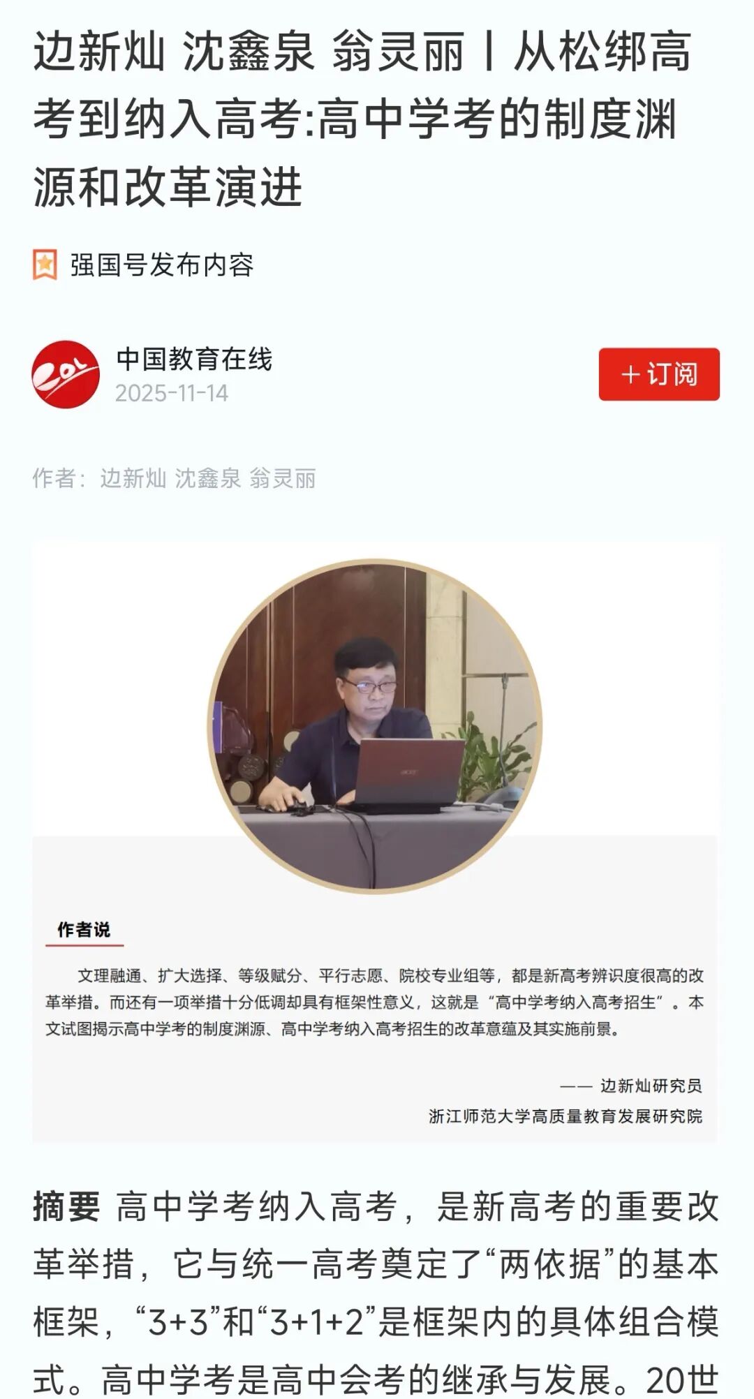 近日,KY开元集团(教师教育学院)边新灿教授与博士生沈鑫泉等在CSSCI期刊《全球教育展望》上发表文章《从松绑高考到纳入高考:高中学考的制度渊源和改革演进》,《学习强国》平台转发了这篇文章。