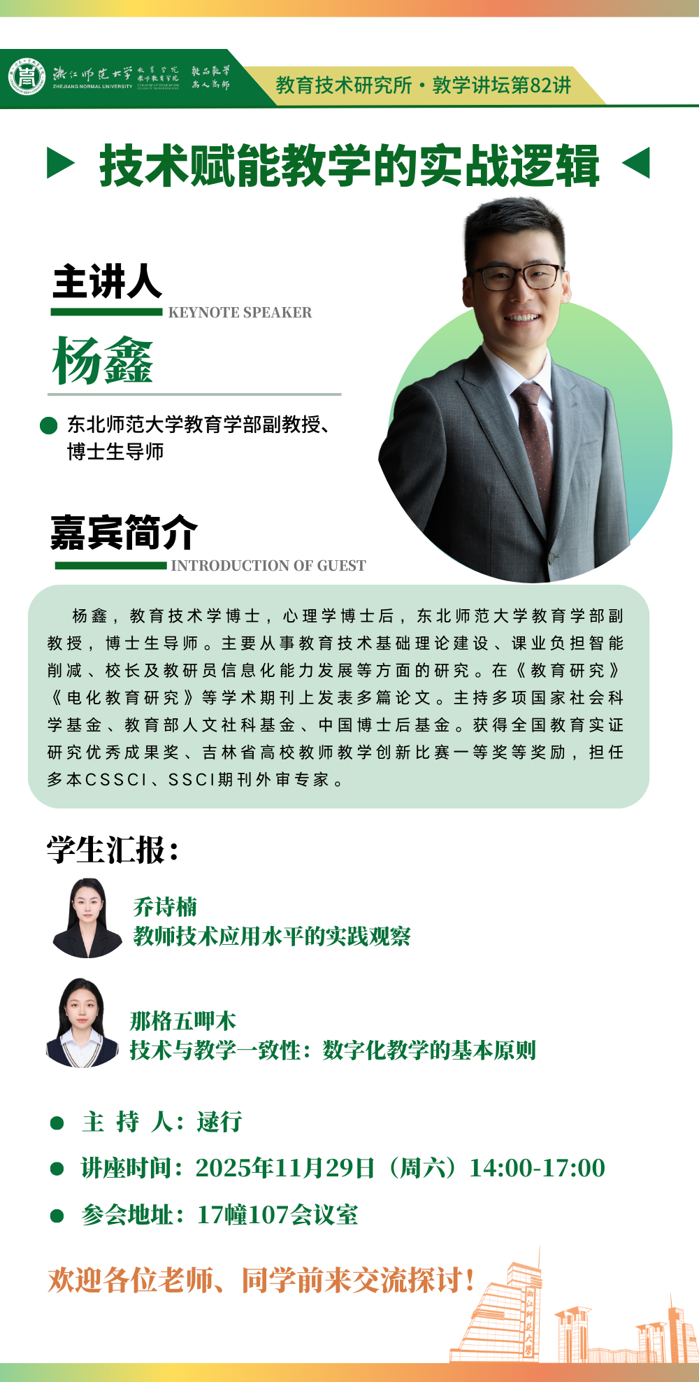 2025年11月29日(周六)下午14:00,东北师范大学教育学部副教授、博士生导师杨鑫副教授将于17幢107会议室,主讲教育技术研究所系列讲座暨敦学讲坛第82讲《技术赋能教学的实战逻辑》。