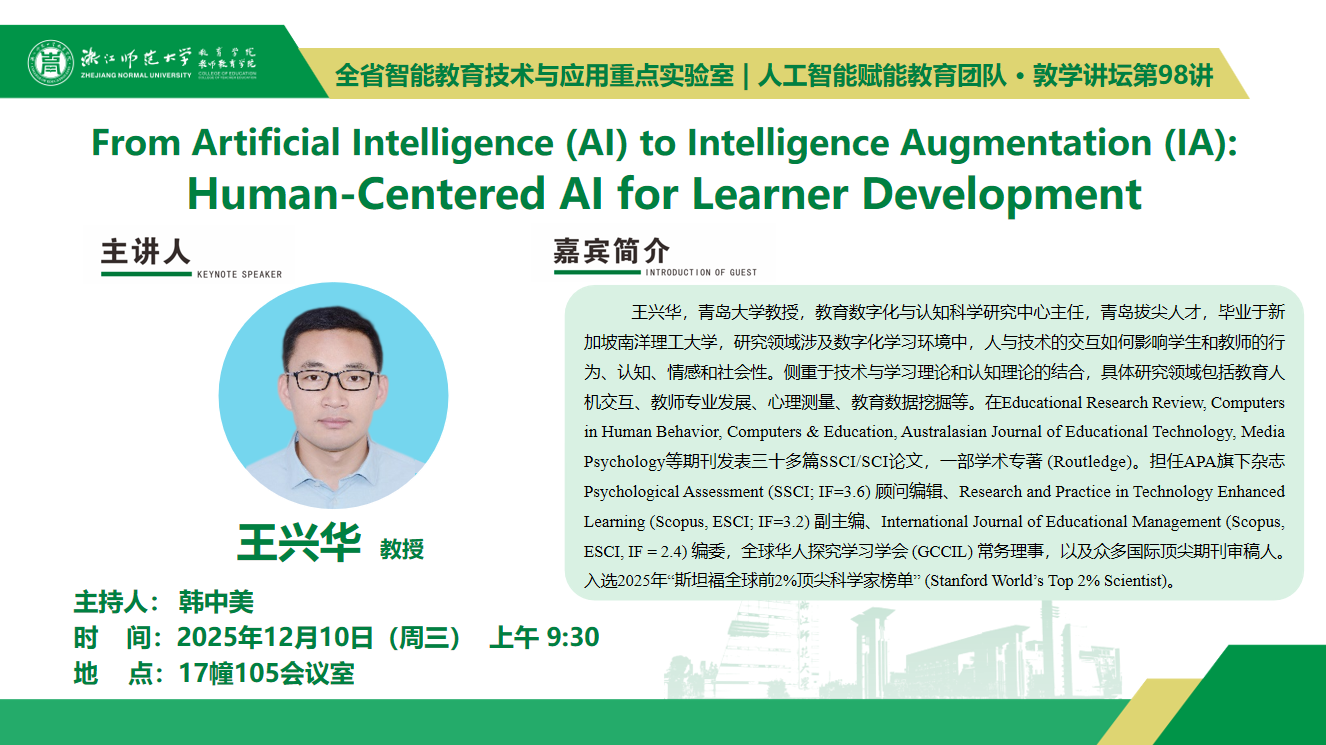 2025年12月10日(周三)上午9:30,青岛大学教授、教育数字化与认知科学研究中心主任、青岛拔尖人才、全球华人探究学习学会(GCCIL) 常务理事王兴华教授将于17幢105会议室,主讲全省智能教育技术与应用重点实验室、人工智能赋能教育团队系列讲座暨敦学讲坛第98讲《From Artificial Intelligence (AI) to Intelligence Augmentation (IA): Human-Centered AI for Learner Development》。主持人为韩中美副教授。