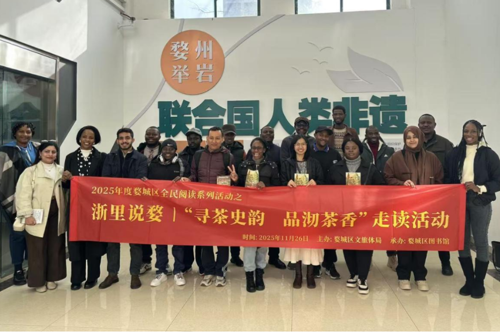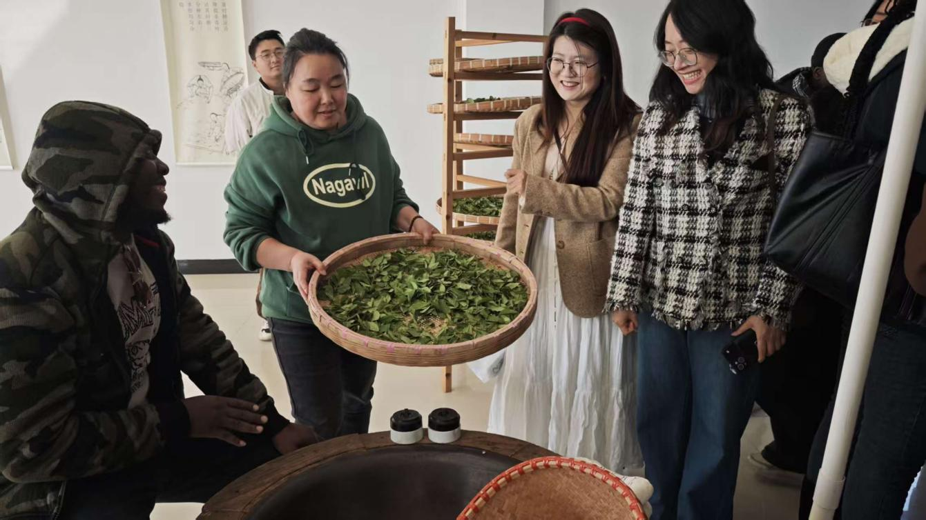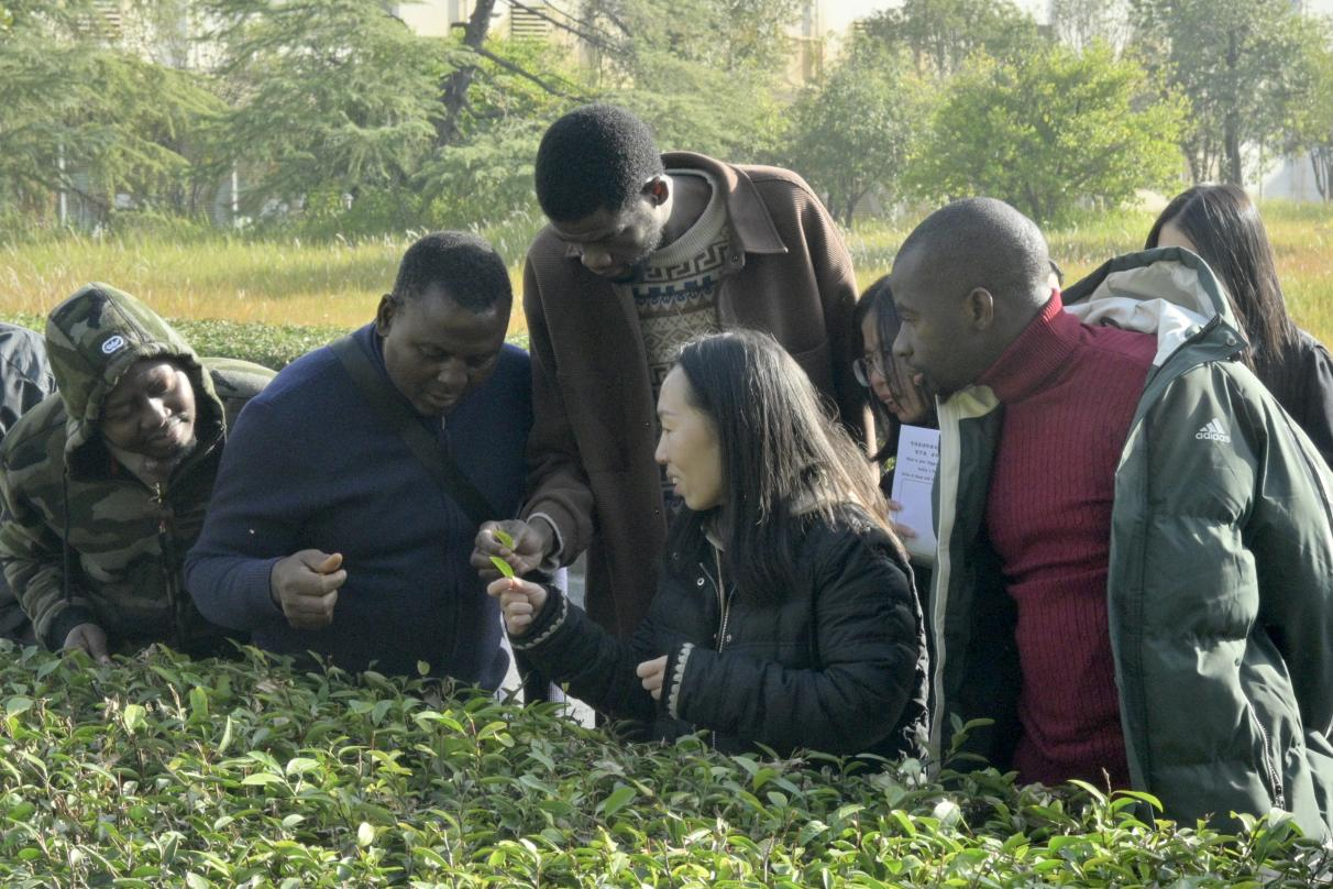 活动伊始,留学生在工作人员的引导下步入茶园。一株株茶树在初冬的微风中舒展绿意。讲解员从举岩茶的形态特征讲起,逐步介绍其生长周期与饮用功效,并拓展讲解了中国各大名茶品类。学生们近距离观察茶树形态,辨识茶叶品种,围绕茶树生长与茶叶分类等问题踊跃提问,在融洽的互动中建立起对茶叶的直观认识。