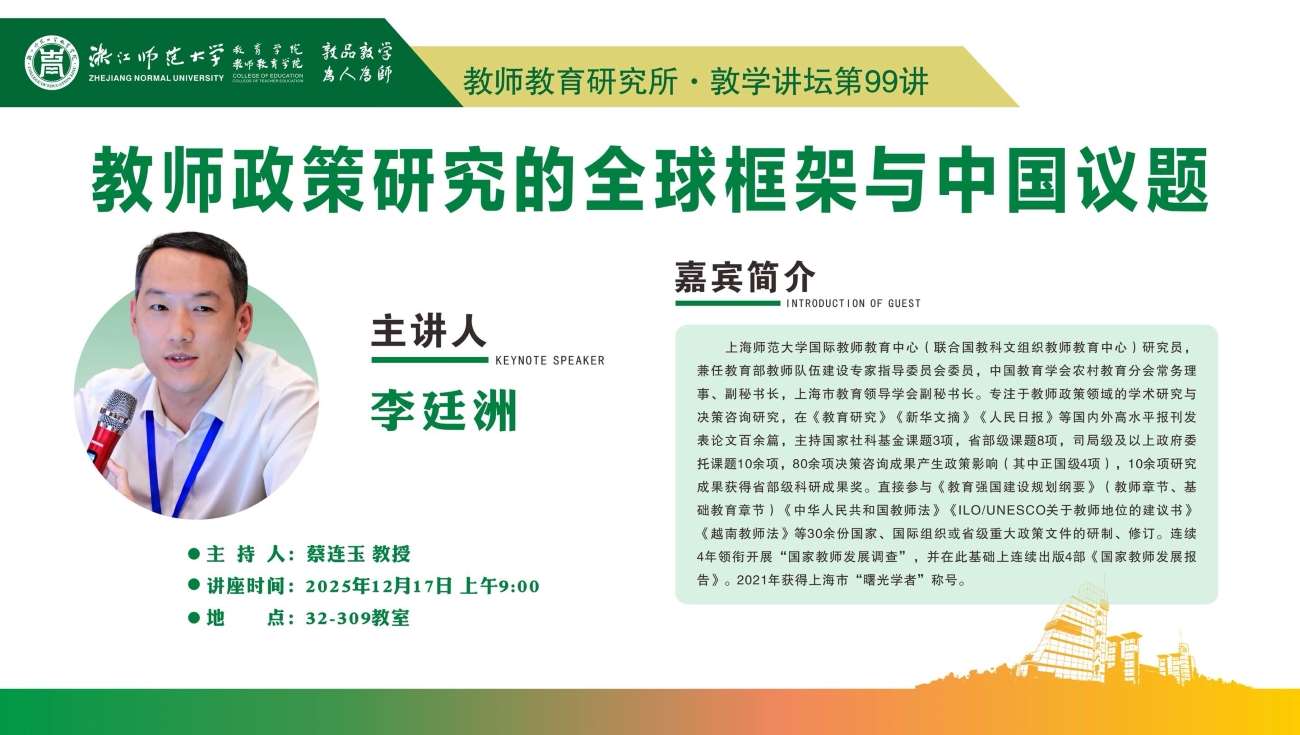 2025年12月17日(周三)上午9:00,上海师范大学国际教师教育中心(联合国教科文组织教师教育中心)研究员、兼任教育部教师队伍建设专家指导委员会委员、中国教育学会农村教育分会常务理事、副秘书长李廷洲将于32幢309教室,主讲教师教育研究所系列讲座暨敦学讲坛第99讲《教师政策研究的全球框架与中国议题》。主持人为蔡连玉教授。