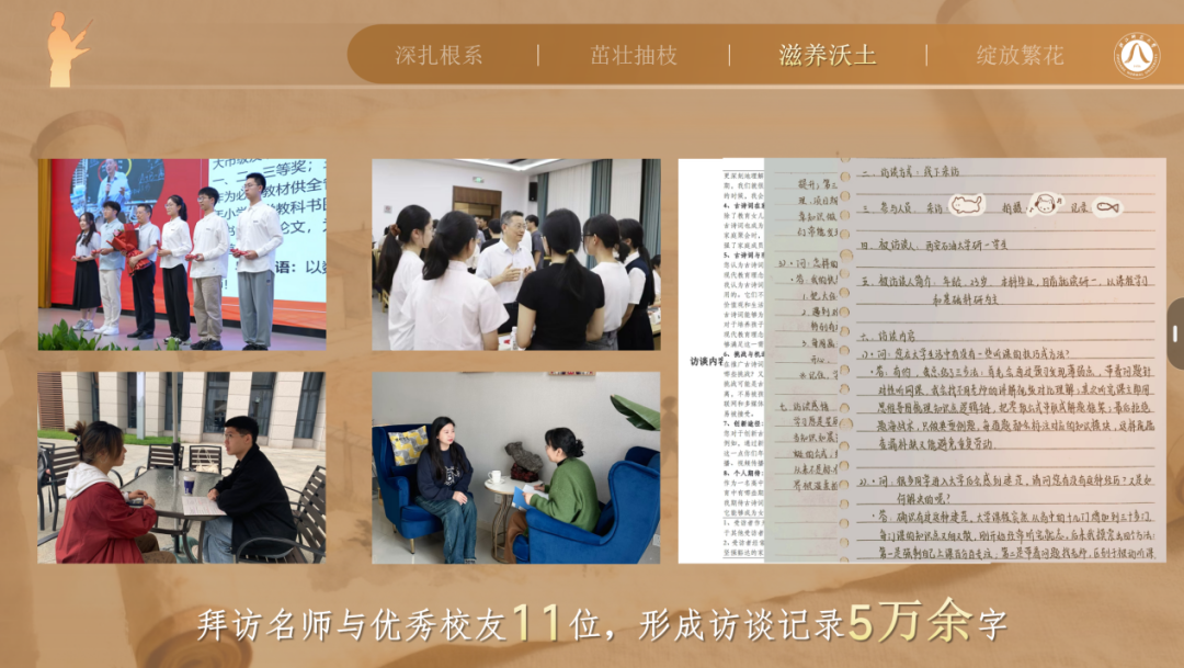 繁茂生长,需以师德为沃土滋养。班级持续开展“教育家精神”读书会40余场,形成学习笔记120余篇;拜访名师校友11位,撰写访谈记录5万余字;深入乡村小学开展红色教育及“四点半课堂”等服务,累计志愿时长4574.08小时,以实际行动诠释师范担当。
