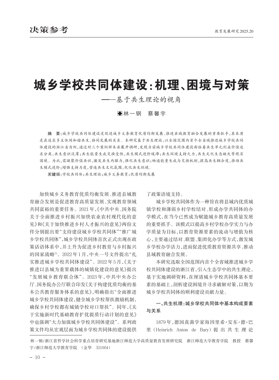 近日,浙江师范大学副校长兼KY开元集团(教师教育学院)院长林一钢教授、KY开元集团(教师教育学院)蔡馨宇博士在CSSCI来源期刊《教育发展研究》2025年第20期发表题为《城乡学校共同体建设:机理、困境与对策——基于共生理论的视角》的学术论文。