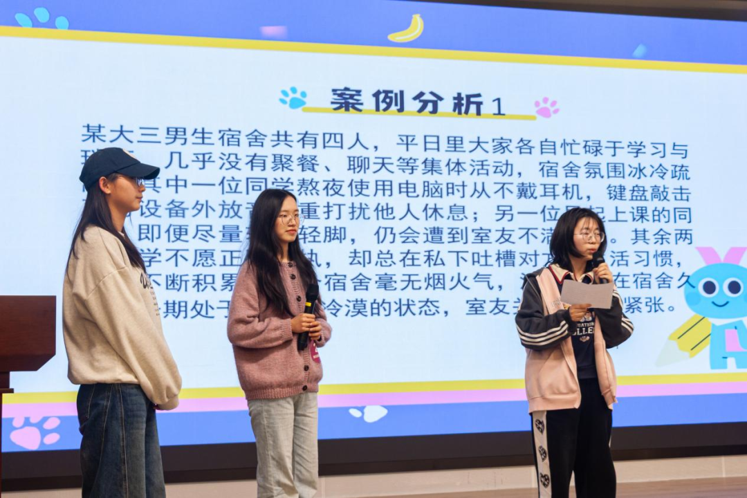 在案例分析环节,各参赛队伍围绕宿舍人际交往、学业发展迷茫、生涯就业焦虑、情绪自我调适等大学生常见的心理困惑与挑战展开深度剖析。面对真实典型的心理场景,他们灵活运用从众效应、情绪ABC理论、习得性无助、人际沟通规律等专业知识,从症状识别、成因剖析到对策提出,层层递进、条理清晰。各队从认知调整、情绪管理、同伴支持、科学求助等角度,提出了兼具专业性与实操性的应对方案。整场展示既具理论深度,又充满人文关怀,充分展现了参赛选手扎实的心理素养与出色的实践应用能力。这一环节不仅是对参赛队伍心理知识掌握程度的综合检验,更是一场“以赛促学、以知养心”的生动实践。