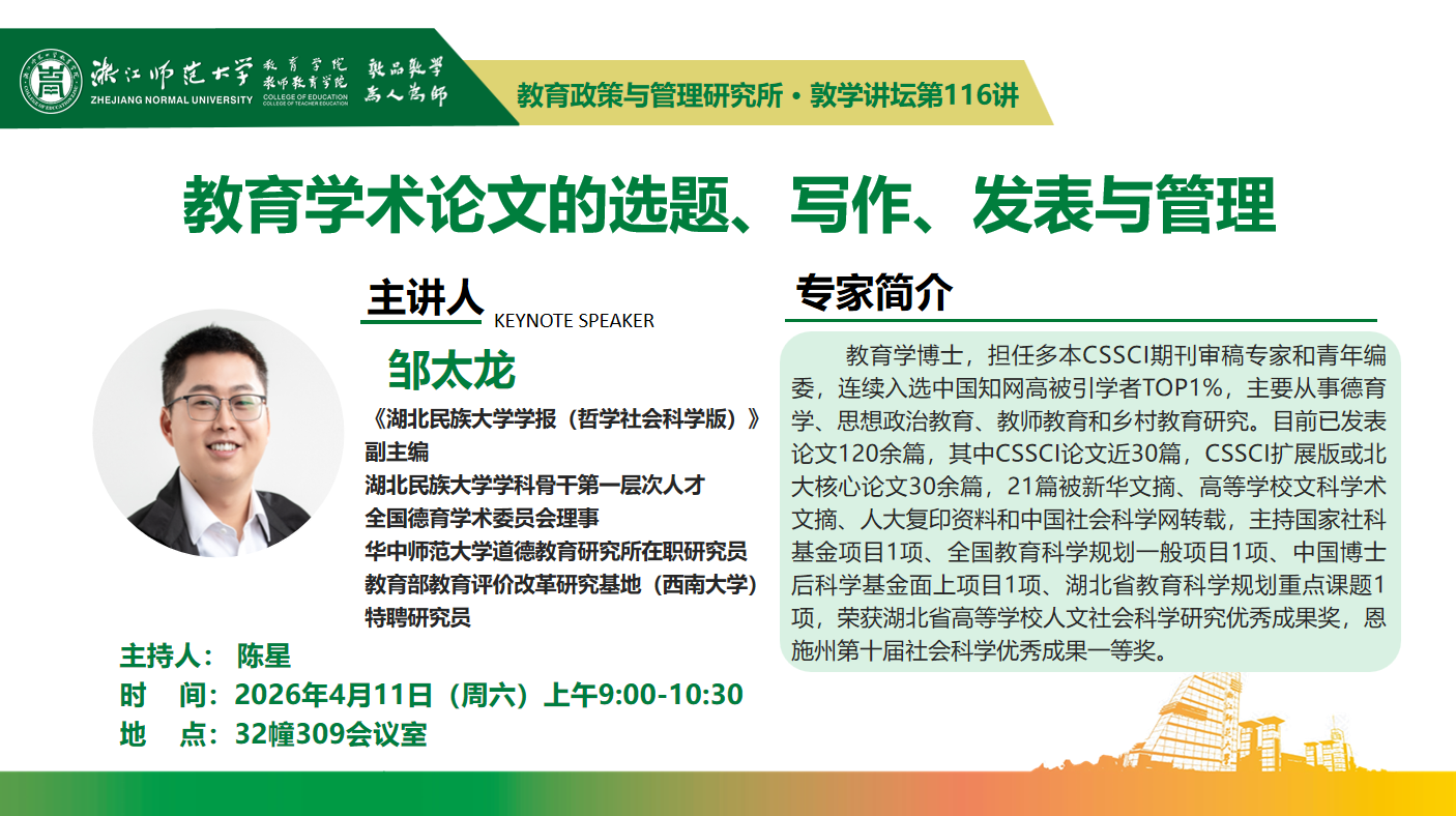 4月11日(周六)上午9:00-10:30,《湖北民族大学学报(哲学社会科学版)》副主编、湖北民族大学学科骨干第一层次人才、全国德育学术委员会理事邹太龙将在32幢309会议室,主讲教育政策与管理研究所系列讲座暨敦学讲坛第116讲《教育学术论文的选题、写作、发表与管理》。主持人为陈星副教授。