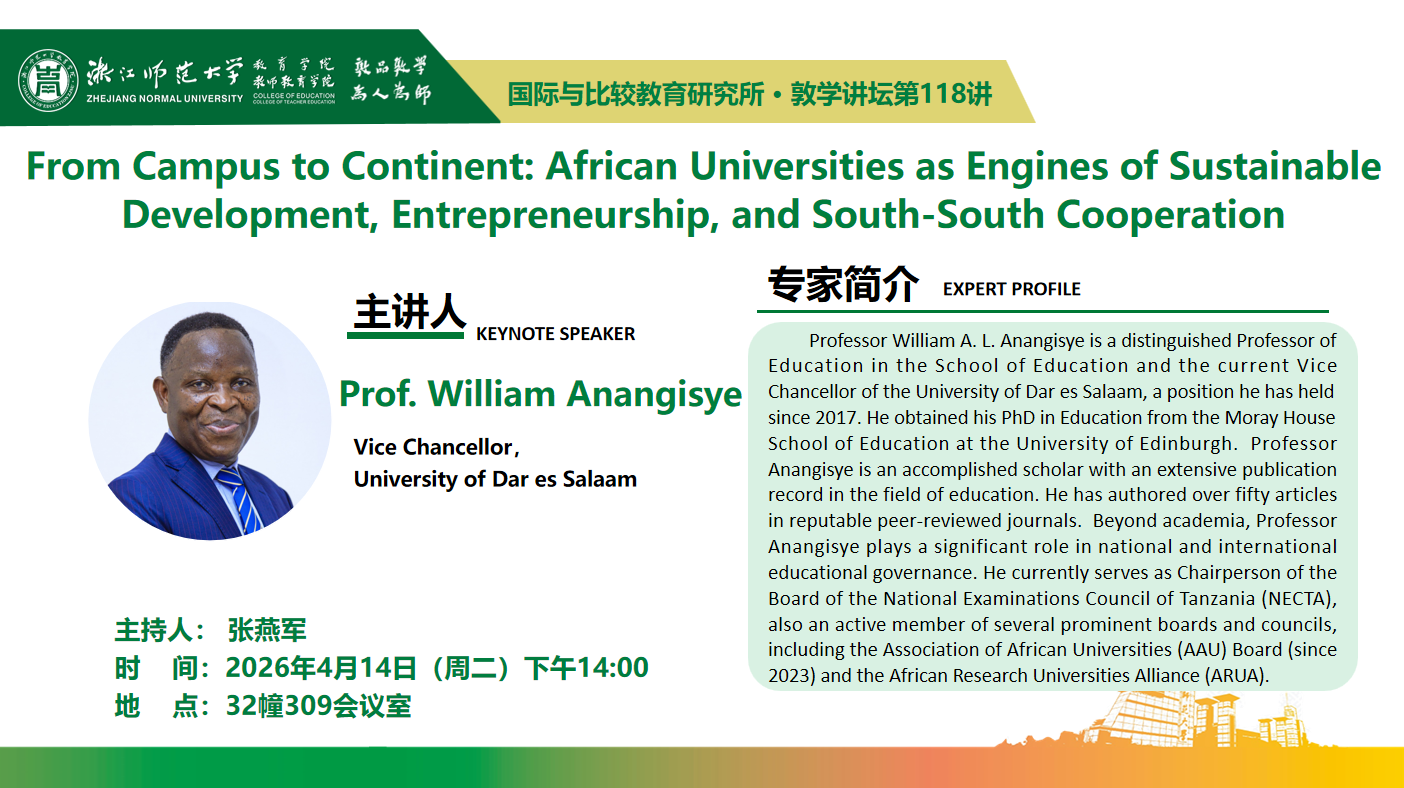 4月14日(周二)下午14:00,William Anangisye教授将在32幢309会议室,主讲国际与比较教育研究所系列讲座暨敦学讲坛第118讲《From Campus to Continent: African Universities as Engines of Sustainable Development, Entrepreneurship, and South-South Cooperation》。主持人为张燕军副教授。